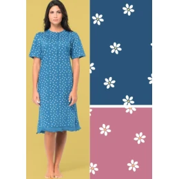Dámská noční košile od značky Karelpiu. Noční košile s krátkým rukávem a hezkým motivem malých kytiček má kulatý dekolt a propínací légu na 5 knoflíků. Délka je po kolena a spodní okraj má našitý malý volánek. Je ušitá ze 100% bavlny a proto se v ní budete cítit velmi příjemně.