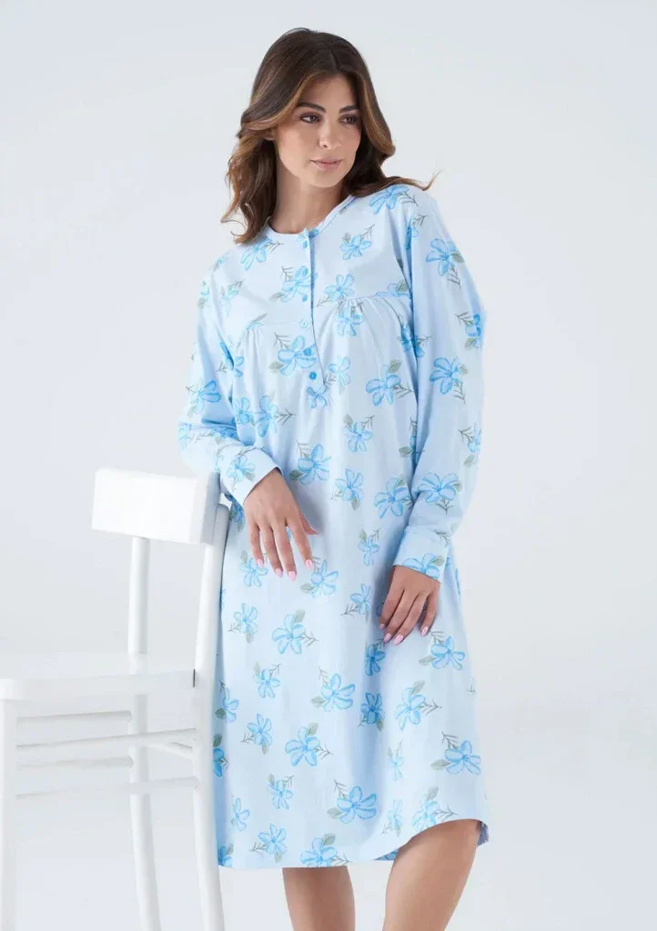 Dámská noční košile od italské značky Karelpiu. Splývavá noční košile mírně rozšířeného střihu má dlouhý rukáv ukončen širokou manžetou s knoflíčkem a délku pod kolena. Kulatý výstřih má rozepínací légu s 5 knoflíčky. V oblasti hrudníku je košile prostřihlá a mírně řasená. Noční košile je z bavlněného jersey materiálu, který se vyznačuje vysokou prodyšností, savostí a je velmi příjemný na omak. Budete se v ní cítit velmi příjemně i v letních měsících.