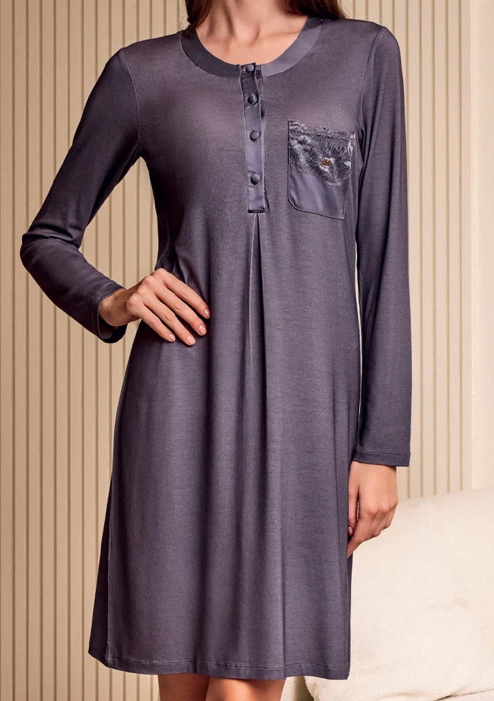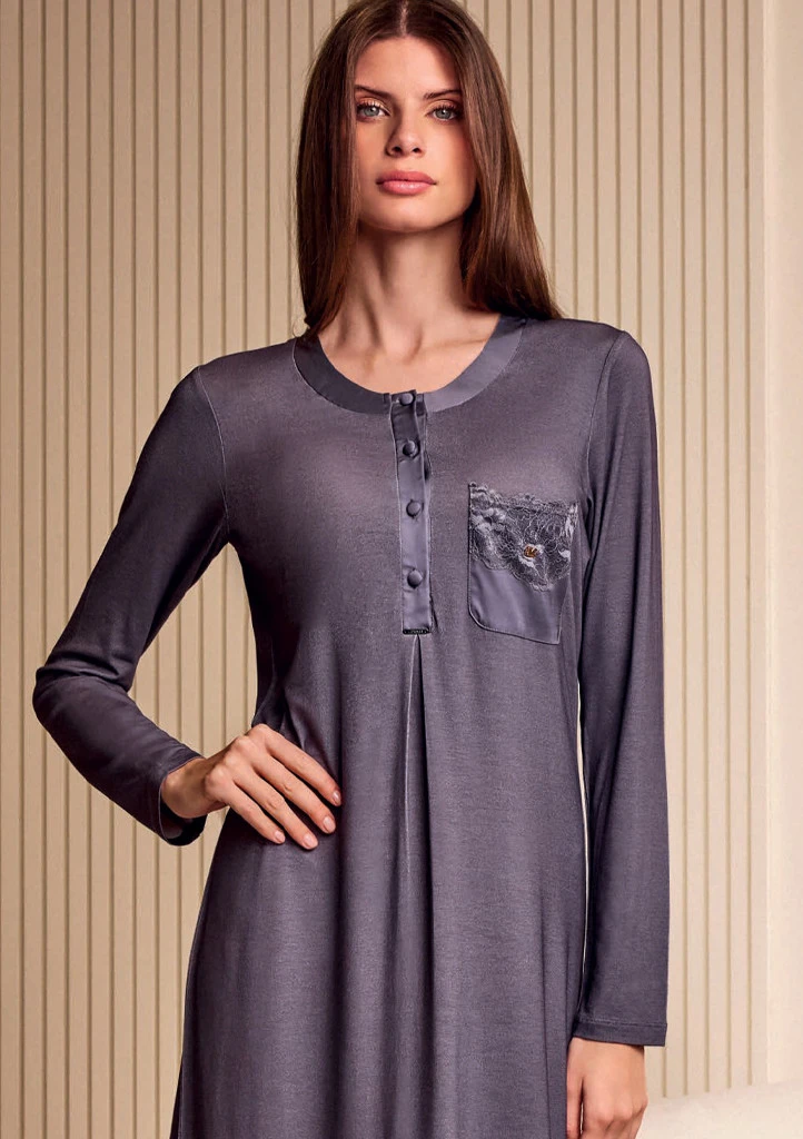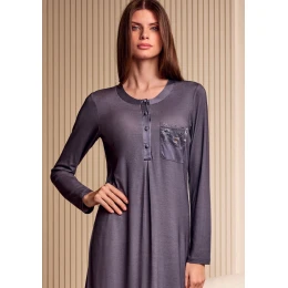 Dámská viskózová noční košile od značky Lormar. Košile je vyrobena z vysokého podílu viskózy, je velmi lehká, jemná a příjemná na dotek. Má dlouhý rukáv, légu se 4 knoflíky a v přední části kapsičku s logem Lormar. Noční košile je balena v dárkové krabici.