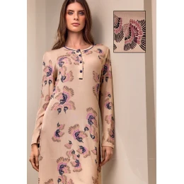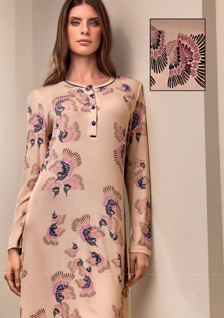Elegantní noční košile Lormar v jemné růžovo-béžové barvě s originálním květinovým motivem působí žensky a velmi sofistikovaně. Má pohodlný rovný střih, dlouhé rukávy a decentní légu se zapínáním na růžové knoflíky, které ladí s růžovým lemováním výstřihu. Měkký, příjemný materiál zaručuje komfort po celou noc a jemný vzor dodává košili jedinečný vzhled. Ideální volba pro všechny, kdo hledají kvalitní a elegantní noční prádlo.