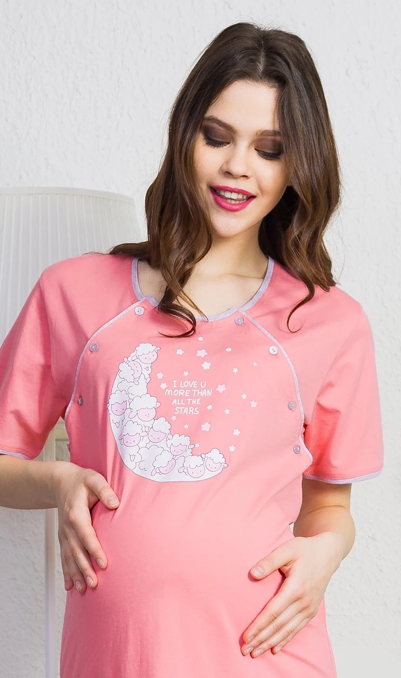 Dámská noční košile mateřská Beránci. Mateřská noční košile je svým střihem vhodná na dobu těhotenství, do porodnice, i ke kojení. Ke kojení slouží průstřihy po stranách košile. Na hrudi je obrázek půlměsíce složeného z roztomilých oveček, který obklopují drobné kytičky. Obrázek doplňuje nápis I love you more than stars. Použitý materiál s obsahem bavlny 100% je příjemný a poddajný na dotek.