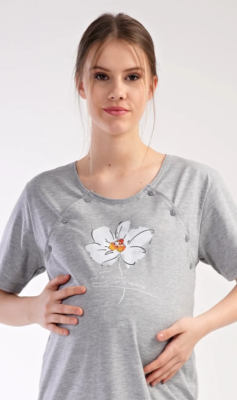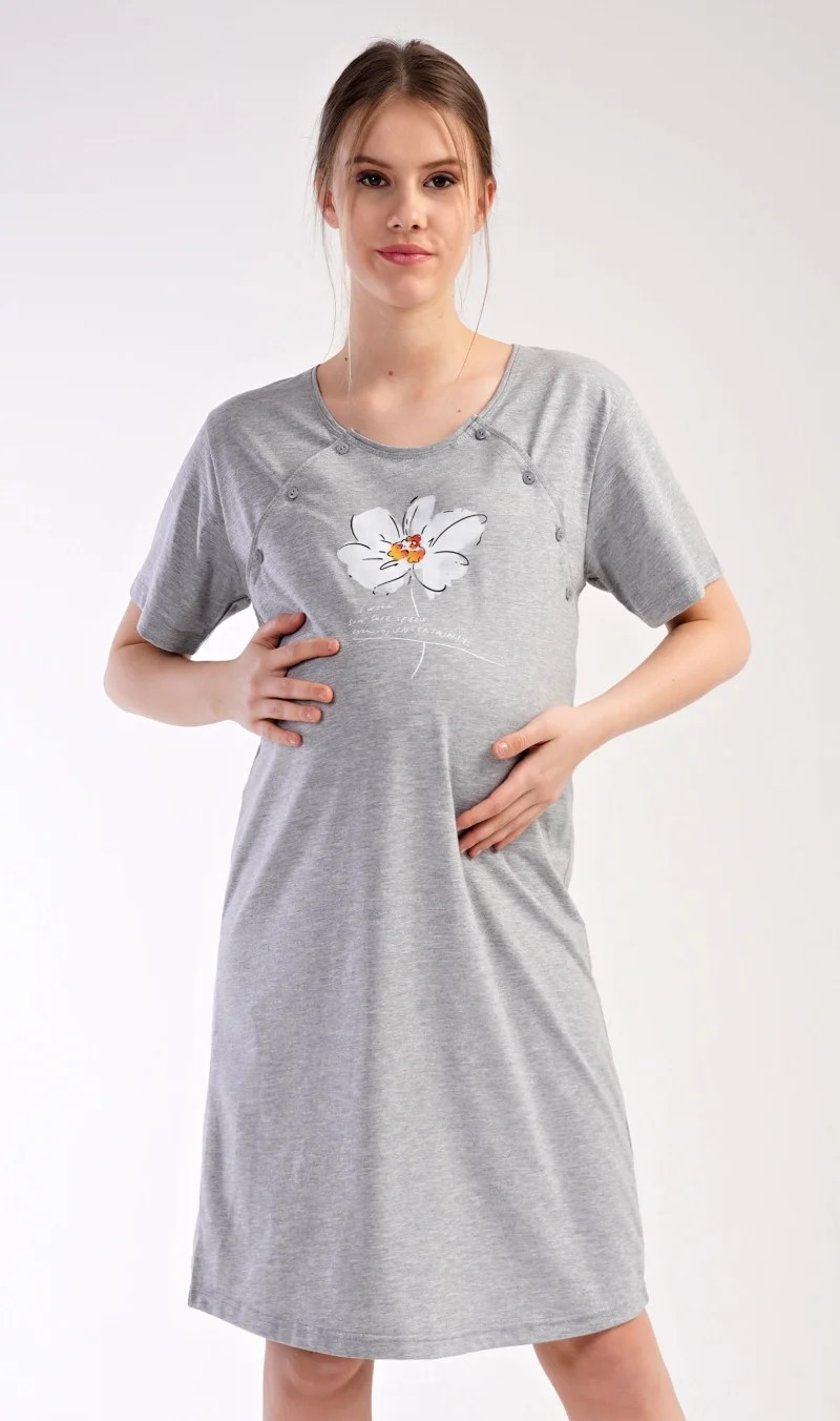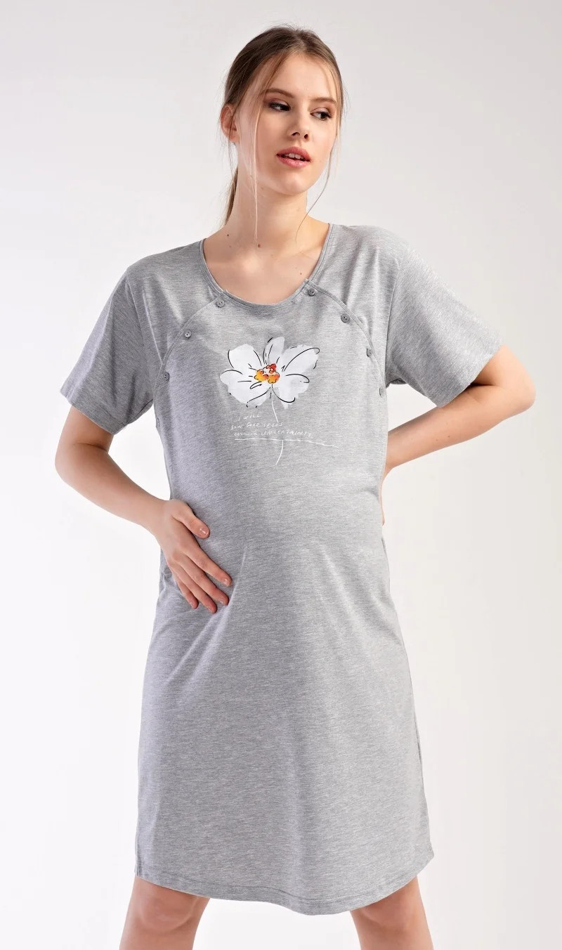 Dámská mateřská noční košile Helena. Noční košile je svým střihem určená na dobu těhotenství, do porodnice i ke kojení. Ke kojení slouží průstřihy po stranách košile, které jsou uzavíratelné na knoflíky. Přední díl košile zdobí květ a drobný nápis. Použitý materiál je příjemný a poddajný na dotek. Obsah bavlny je 70%.
