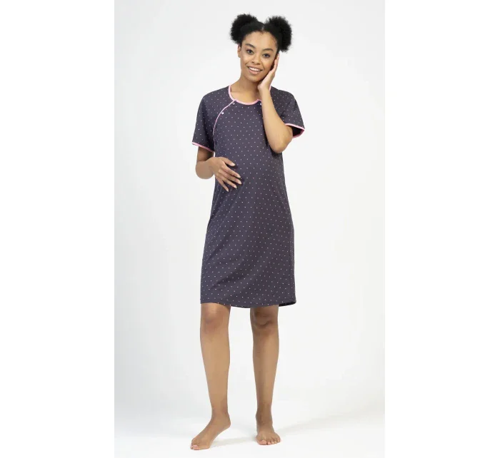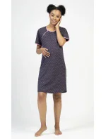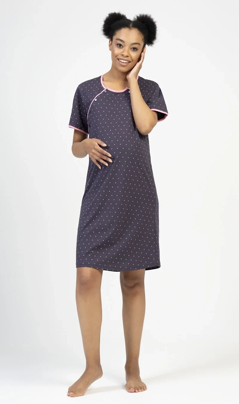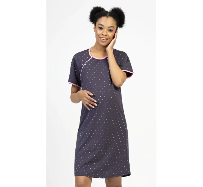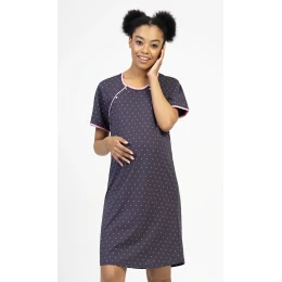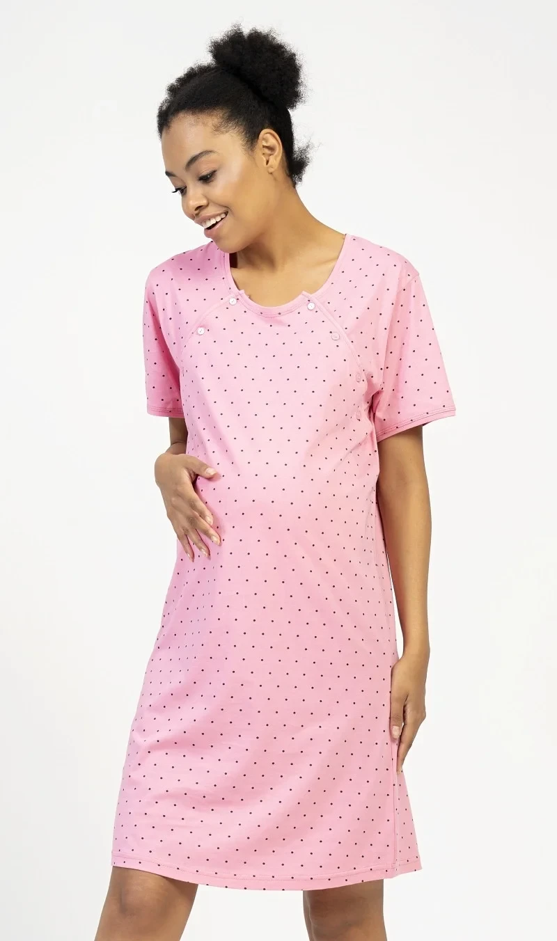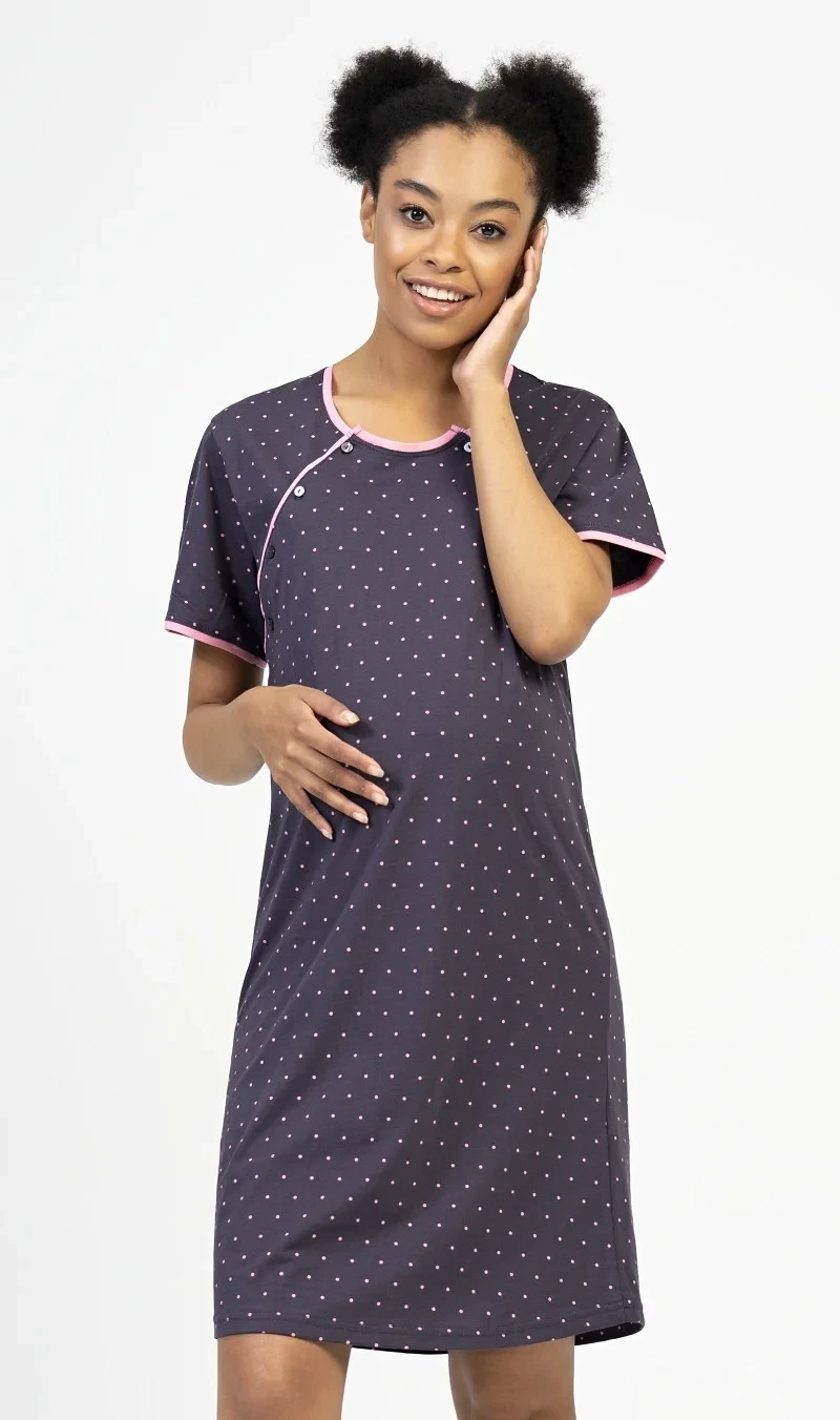 Dámská noční košile mateřská Martina. Dámská noční košile mateřská je svým střihem určená na dobu těhotenství, do porodnice i ke kojení. Ke kojení slouží průstřihy po stranách košile, které jsou uzavíratelné na knoflíky. Látka nočn košile je potištěna jemným puntíčkem. Použitý materiál je jemný a poddajný na dotek. Košile je vhodná na denní nošení.