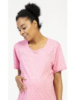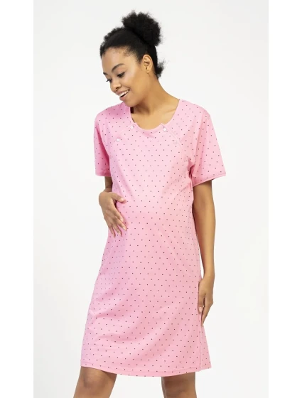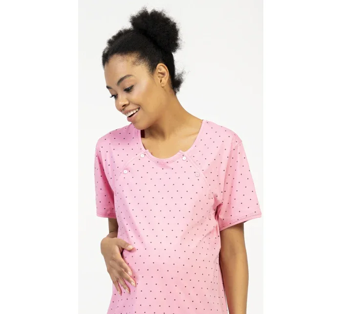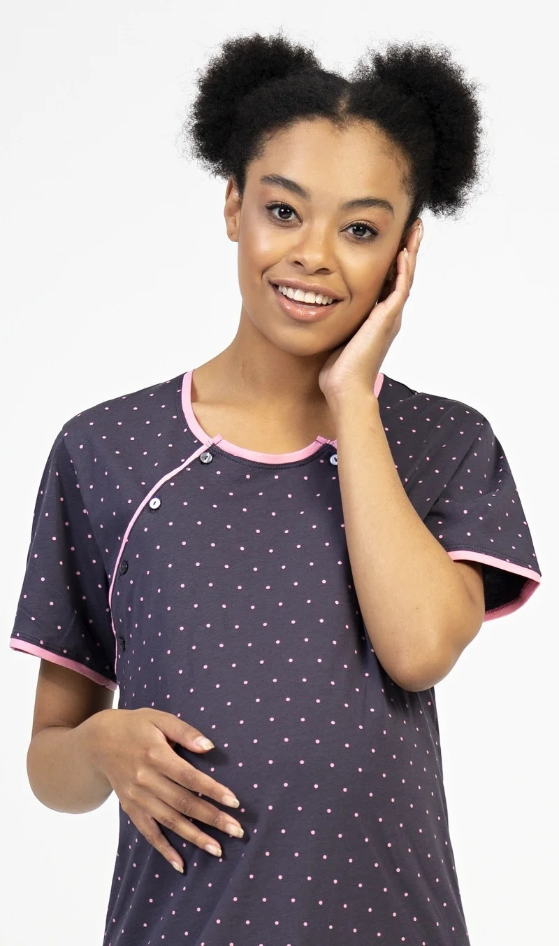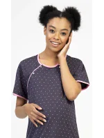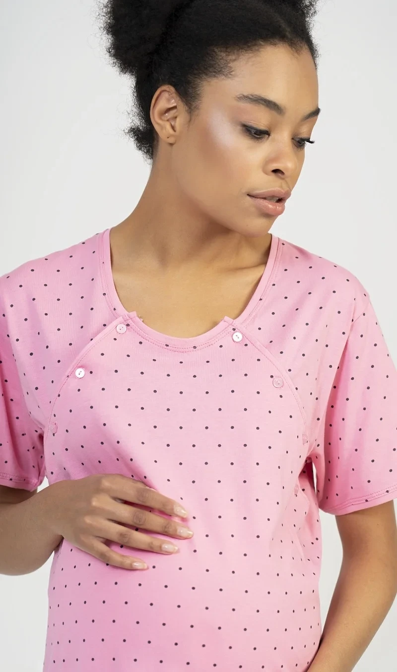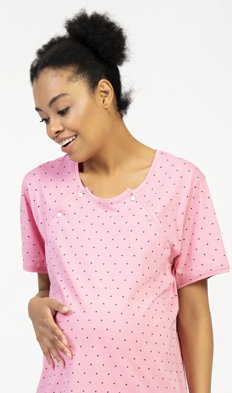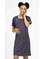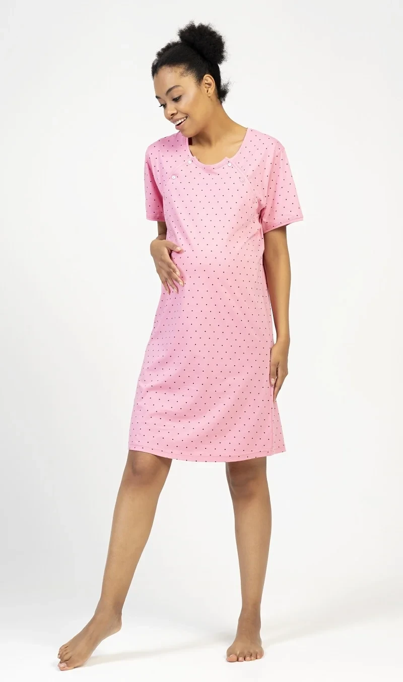 Dámská noční košile mateřská Martina. Dámská noční košile mateřská je svým střihem určená na dobu těhotenství, do porodnice i ke kojení. Ke kojení slouží průstřihy po stranách košile, které jsou uzavíratelné na knoflíky. Látka nočn košile je potištěna jemným puntíčkem. Použitý materiál je jemný a poddajný na dotek. Košile je vhodná na denní nošení.