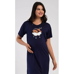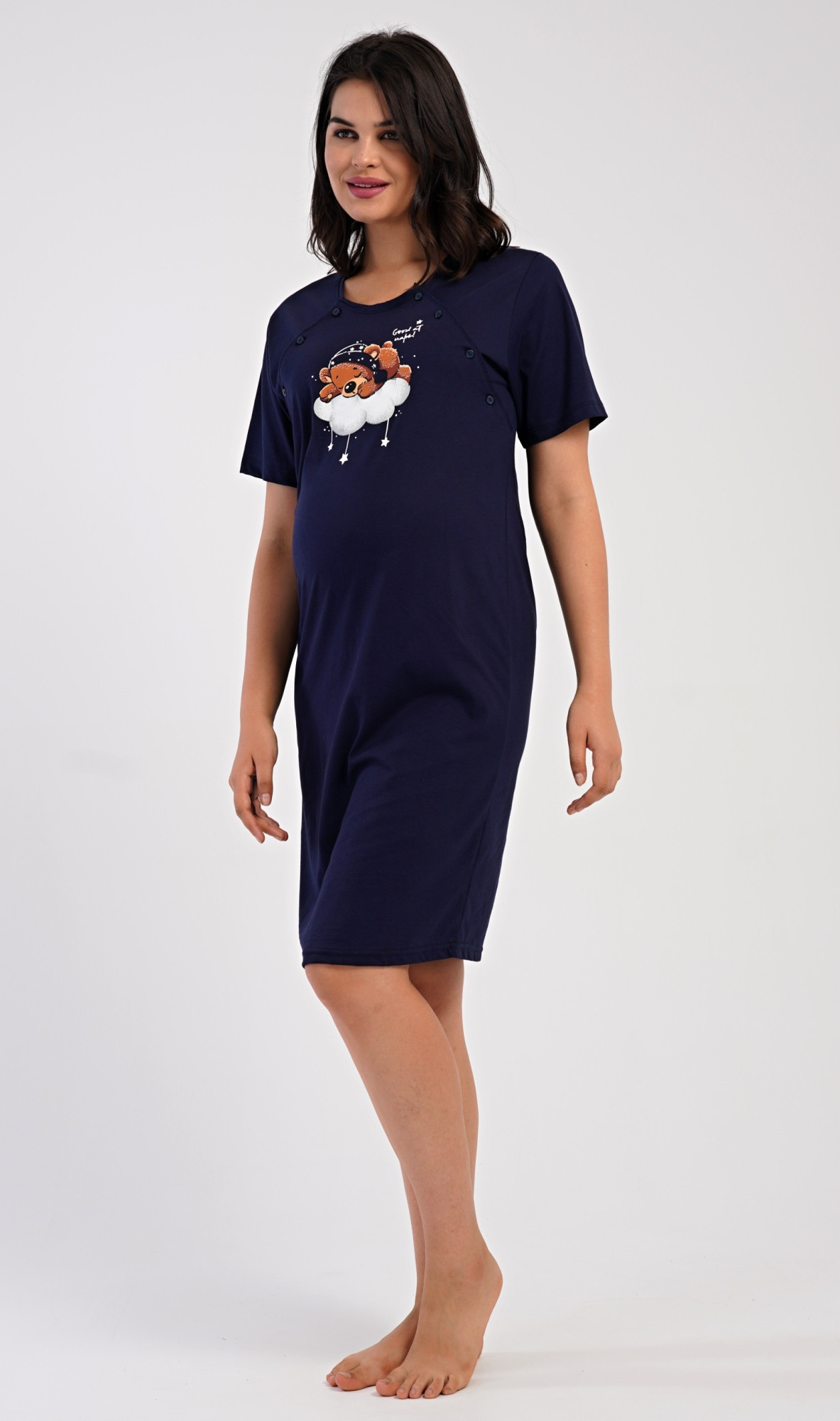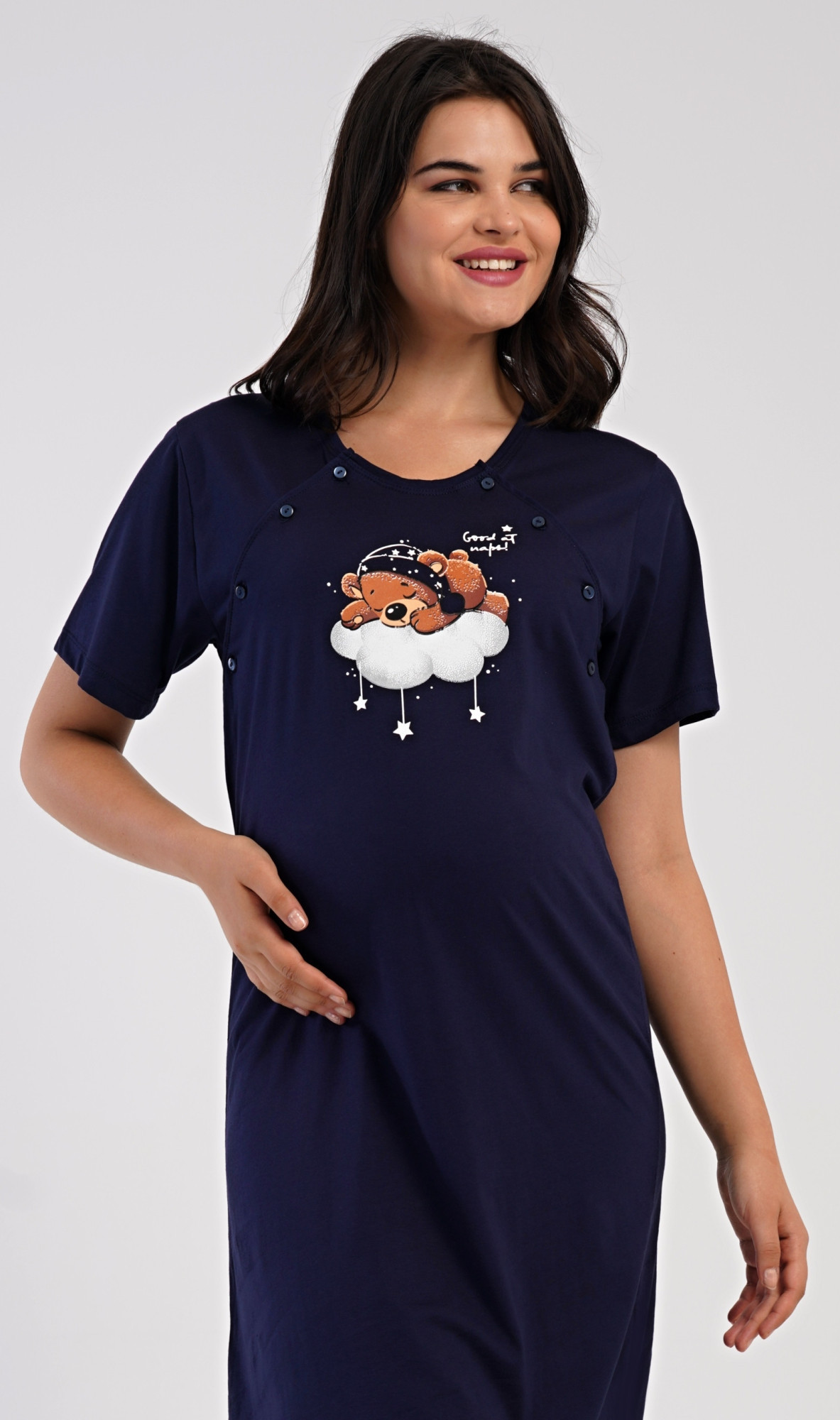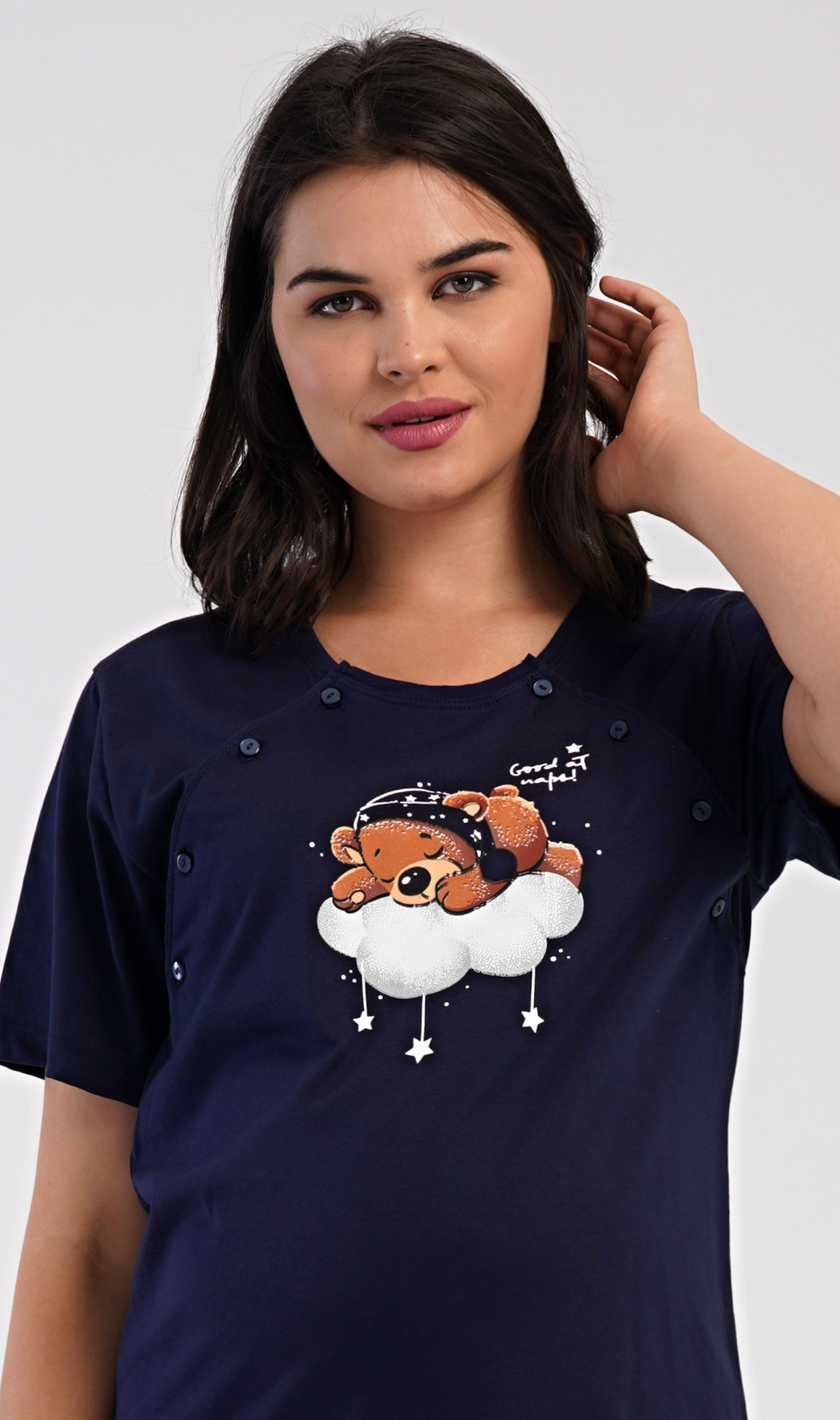 Dámská bavlněná mateřská noční košile s krátkým rukávem Méďa na obláčku. Noční košile je svým střihem určená na dobu těhotenství, do porodnice i ke kojení. Ke kojení slouží průstřihy po stranách košile, které jsou uzavíratelné na knoflíky. Jednobarevná košile je ozdobena obrázkem medvídka, který odpočívá na obláčku. Použitý materiál s podílem bavlny 100% je příjemný a poddajný na dotek.