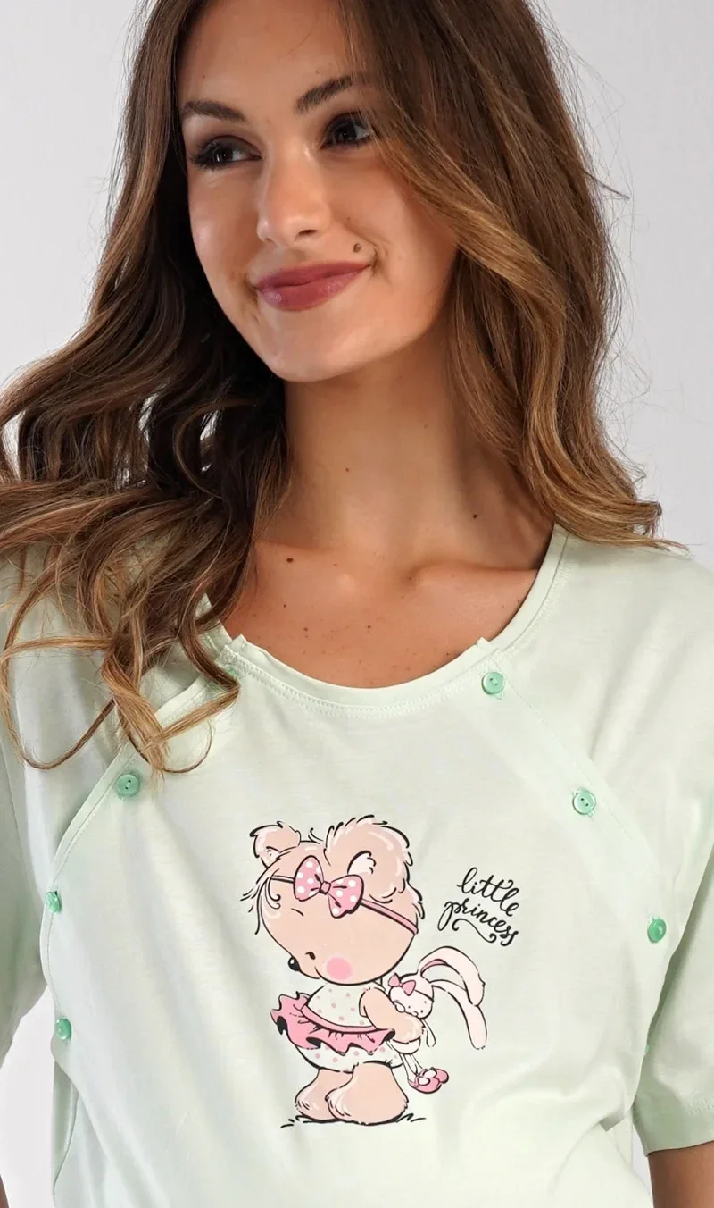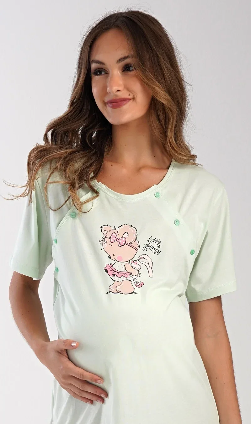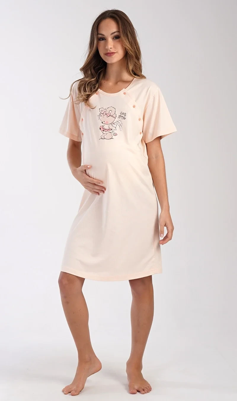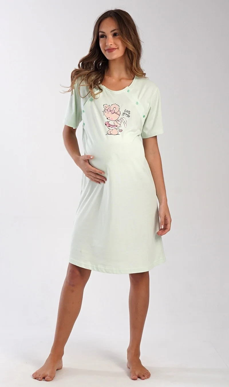 Dámská bavlněná mateřská noční košile Maruška. Noční košile je svým střihem určená na dobu těhotenství, do porodnice i ke kojení. Ke kojení slouží průstřihy po stranách košile, které jsou uzavíratelné na knoflíky. Jednobarevná košile je na hrudi ozdobena obrázkem malého medvídka. Použitý materiál s podílem bavlny 100% je příjemný a poddajný na dotek.