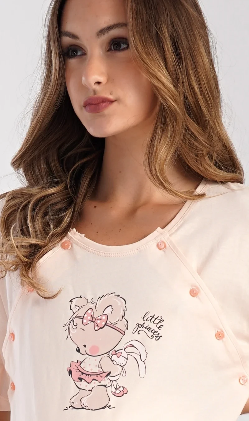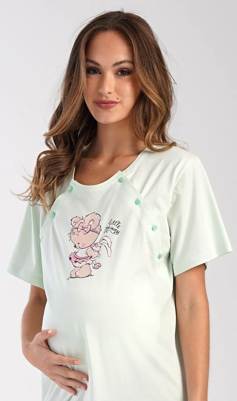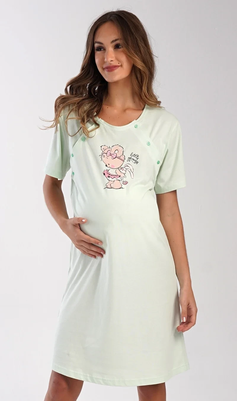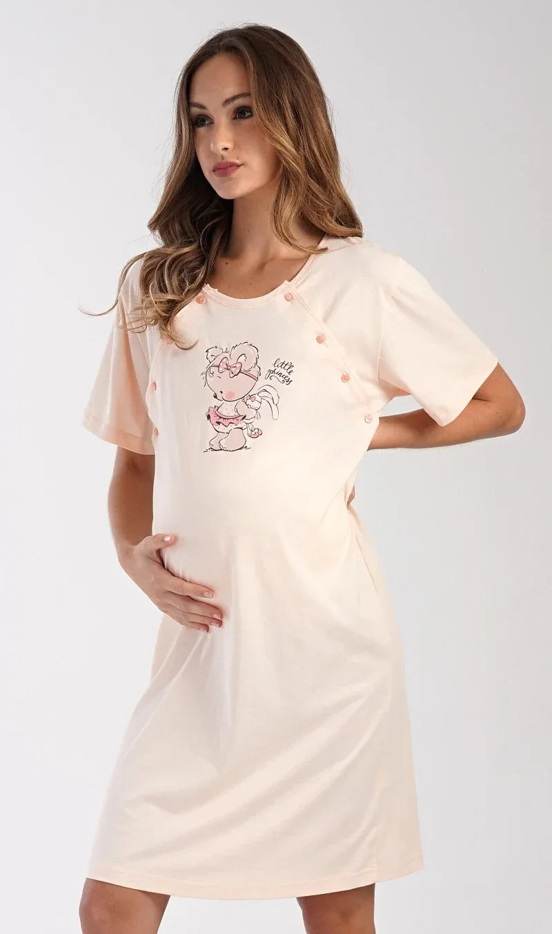 Dámská bavlněná mateřská noční košile Maruška. Noční košile je svým střihem určená na dobu těhotenství, do porodnice i ke kojení. Ke kojení slouží průstřihy po stranách košile, které jsou uzavíratelné na knoflíky. Jednobarevná košile je na hrudi ozdobena obrázkem malého medvídka. Použitý materiál s podílem bavlny 100% je příjemný a poddajný na dotek.