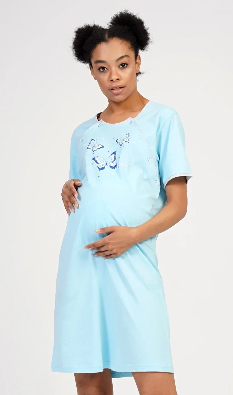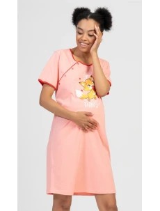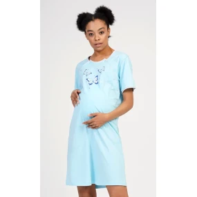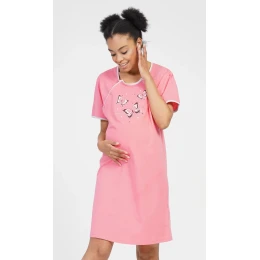 Dámská bavlněná mateřská noční košile Leontýna. Noční košile je svým střihem určená na dobu těhotenství, do porodnice i ke kojení. Ke kojení slouží průstřihy po stranách košile, které jsou uzavíratelné na knoflíky. Košile je ozdobena potiskem květů. Použitý materiál je příjemný a poddajný na dotek. Obsah bavlny u obou kombinací je 100%.