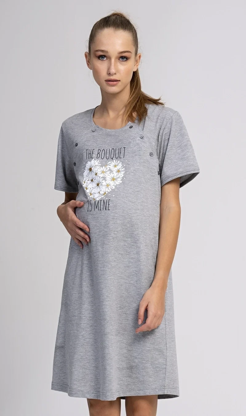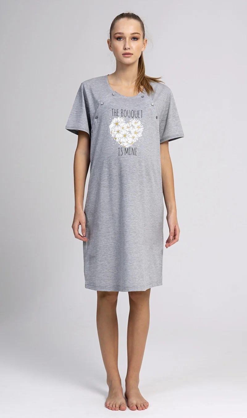 Dámská mateřská noční košile Srdce z kopretin. Dámská noční košile je svým střihem vhodná na období těhotenství, do porodnice, i ke kojení. Ke kojení slouží průstřihy po stranách košile, které jsou uzavíratelné na knoflíky. Na hrudi jinak jednobarevné košilky je srdíčko z kopretin s popisem 'The Bouguet is mine'. Použitý materiál s podílem bavlny 70% je příjemný a poddajný na dotek.