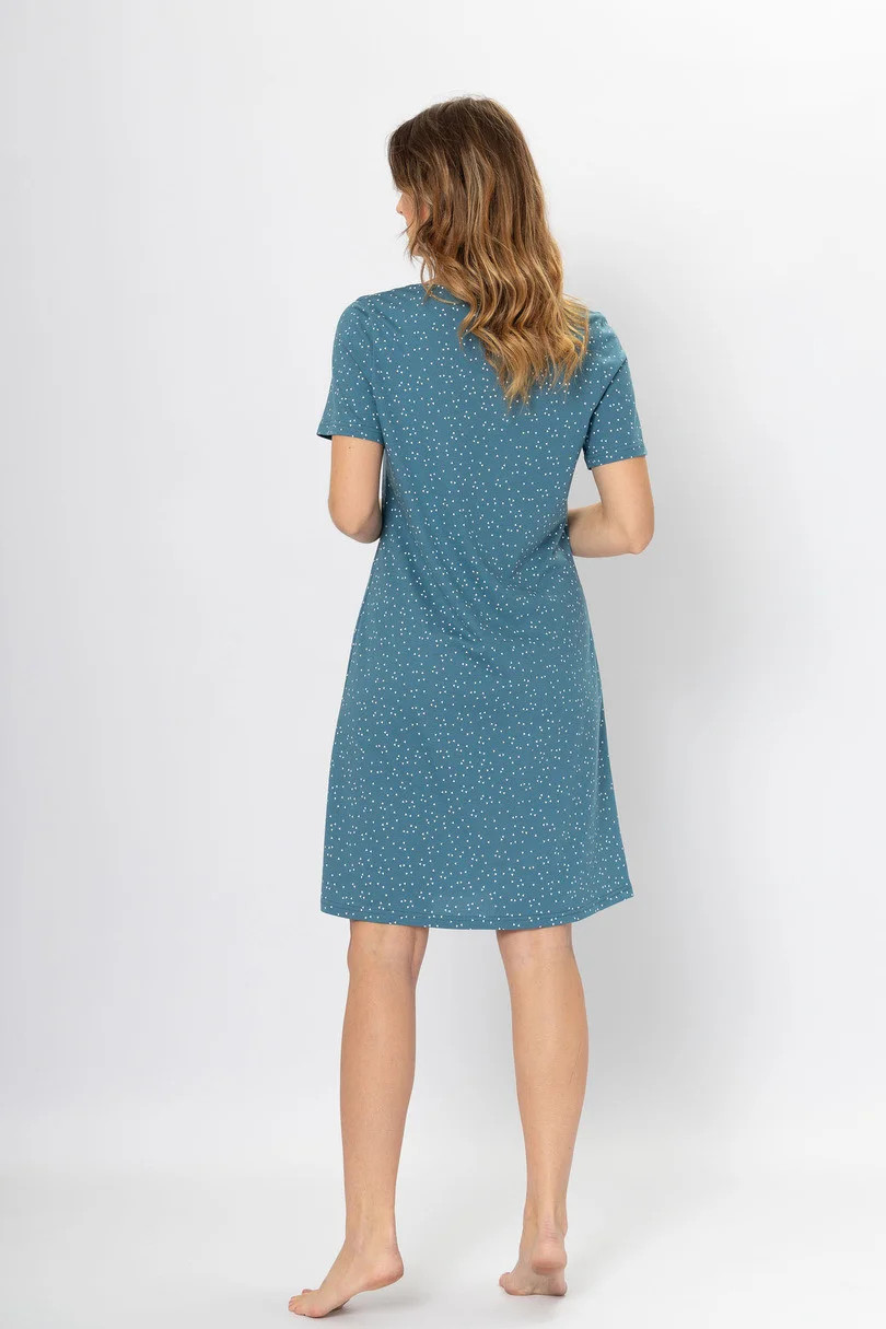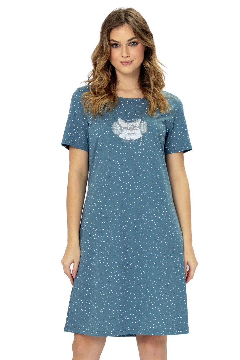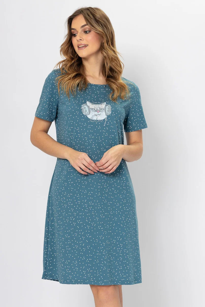 Dámské tričko s krátkým rukávem ušité z kvalitní vzorované bavlny. Jemný potisk na hrudi, délka ke kolenům, kulatý výstřih.