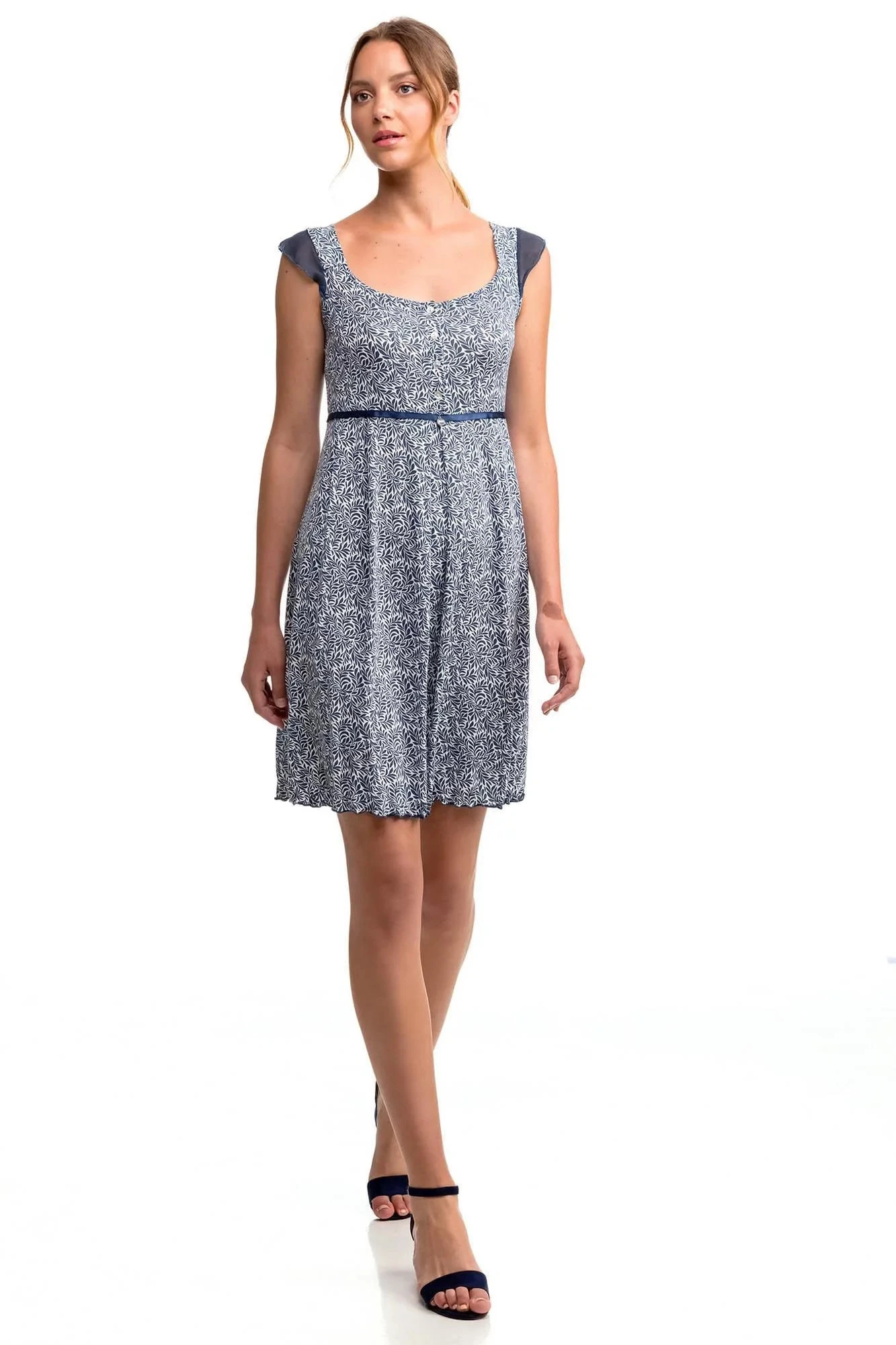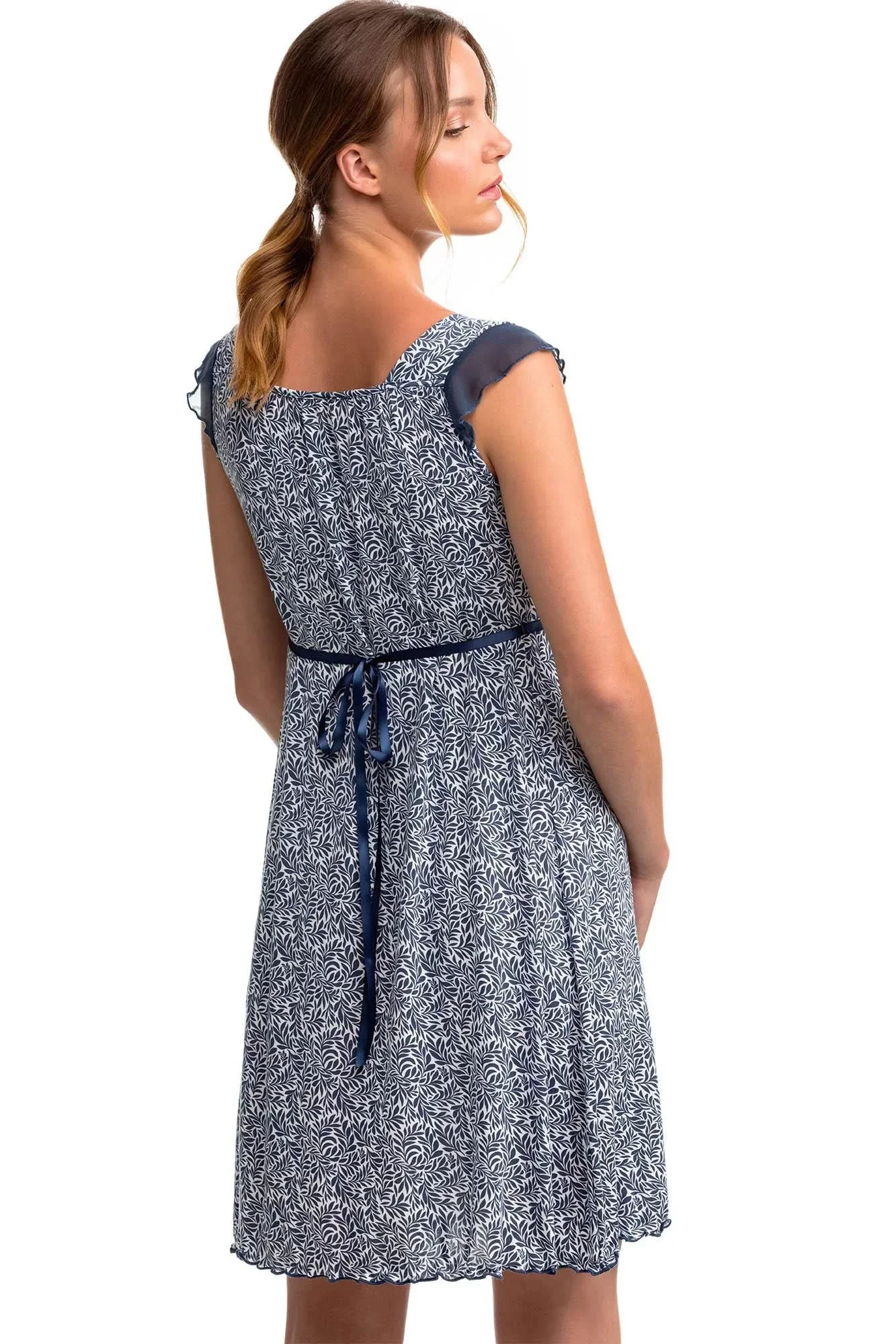 Dámská noční košile s rostlinným motivem pro pohodu a dobré spaní. Noční košili zdobí ramínka s volánkem a knoflíková léga, v pase je ozdobná saténová stužka na zavazování. Košilka je vyrobená z vysoce kvalitního Micro-modalu s příměsí Elastanu. Přírodní Micro-modal poskytuje vyjímečnou měkkost, lehkost a pohodlí, je prodyšný, při praní se nesráží, dobře absorbuje pot a rychle schne, zatímco Elastan dodává oděvu potřebnou pružnost. Noční košile je vhodná pro těhtoné a kojící matky.