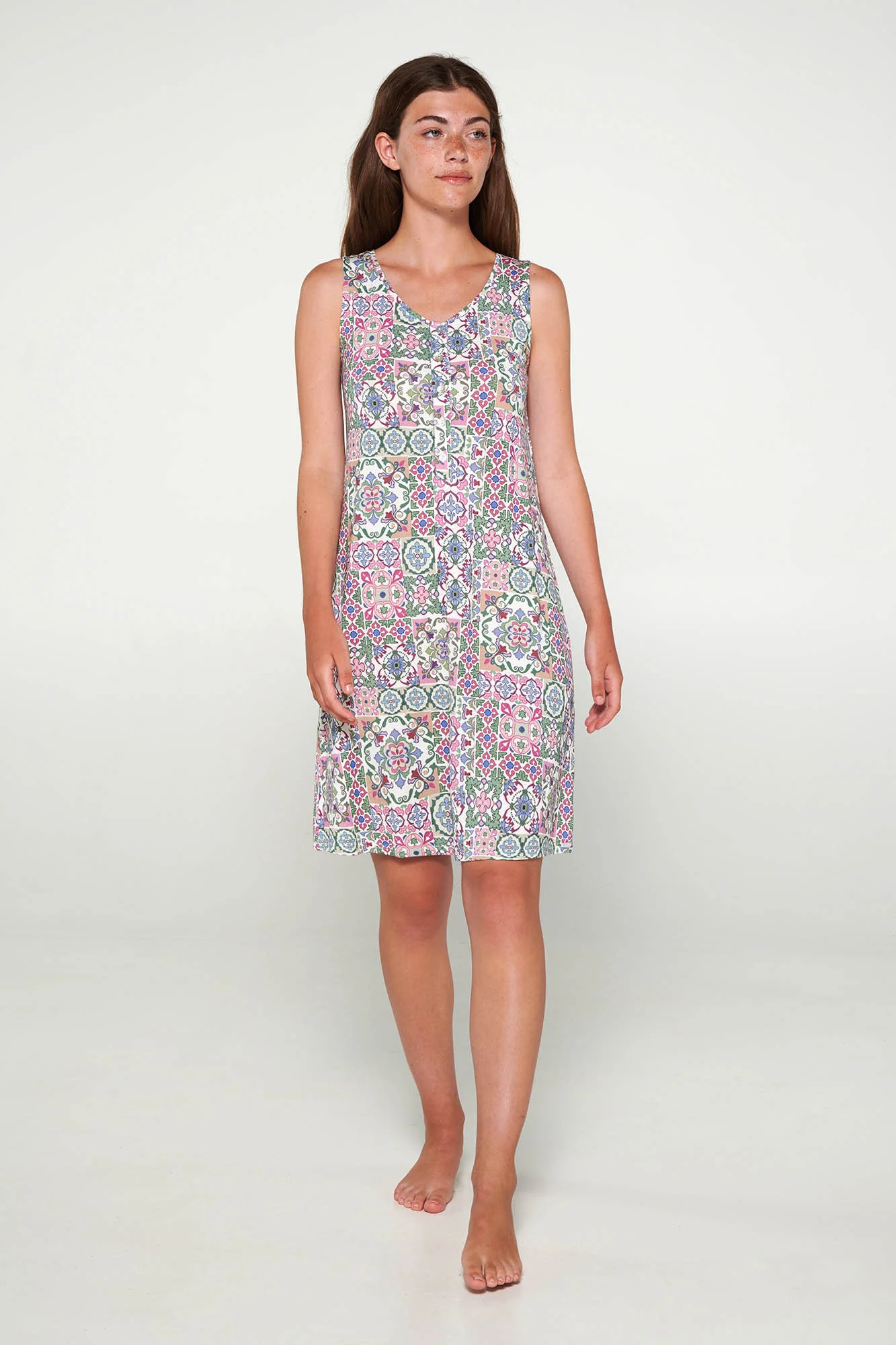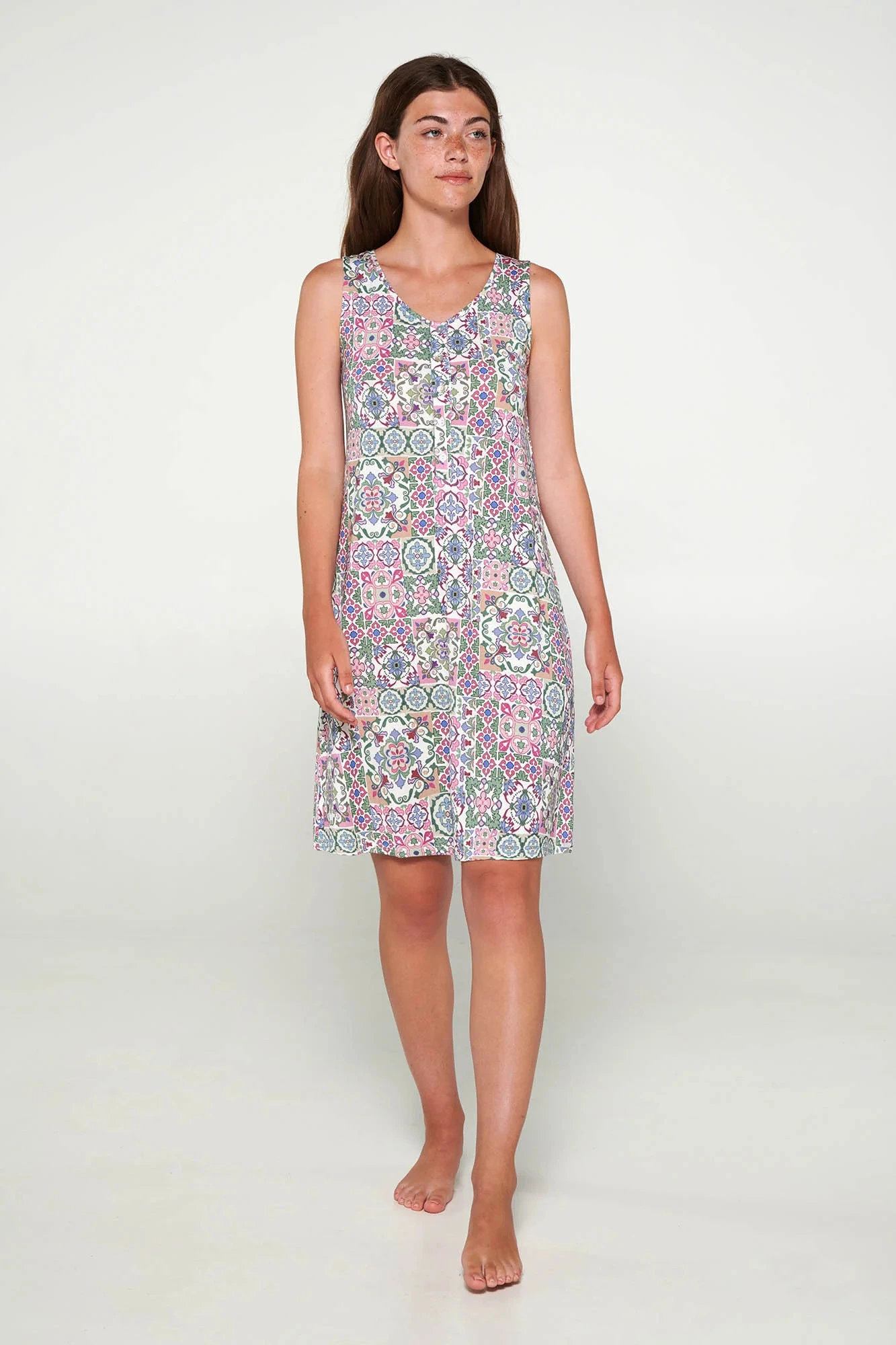 Noční košile bez rukávů s knoflíkovou légou ve volném střihu. Vyrobeno z měkké tkaniny ve vintage stylu.