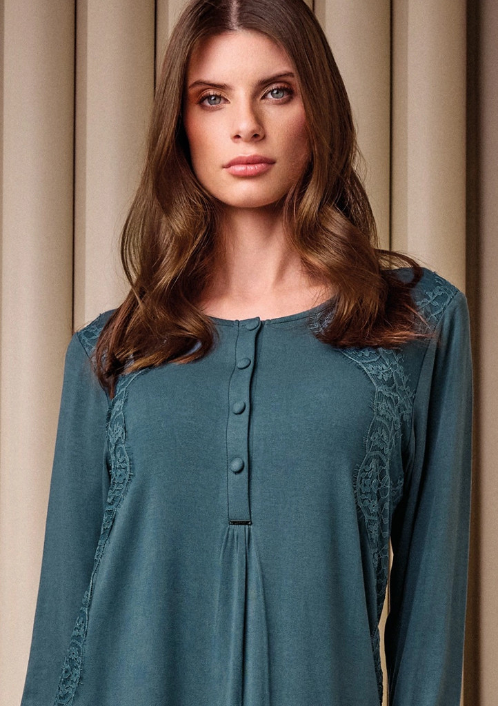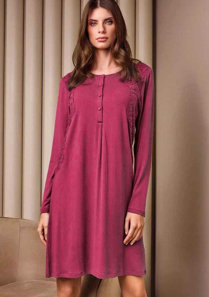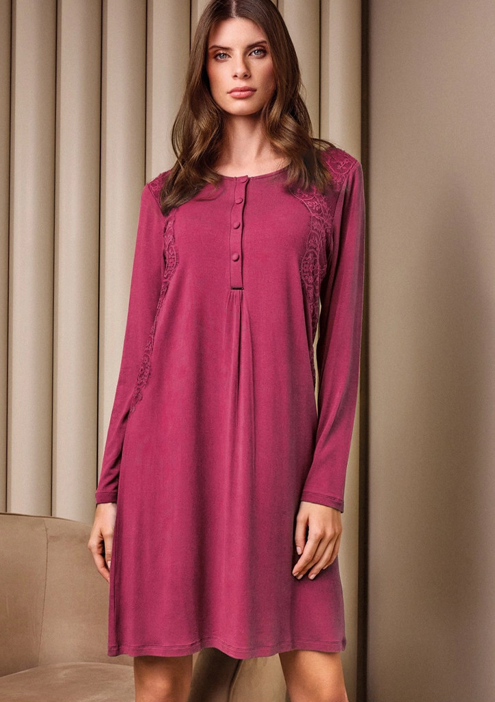 Dámská noční košilka Lormar je vyrobená z mimořádně jemného a lehkého materiálu, který je příjemný na dotek a ideální pro celonoční pohodlí. Košilka má dlouhé rukávy a elegantní zapínání na knoflíčky v horní části. Po stranách je zdobena jemnou krajkovou aplikací, která dodává celému modelu ženský a sofistikovaný vzhled. Volnější střih se krásně přizpůsobí postavě a poskytuje maximální komfort při nošení.