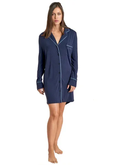 Dámská noční košile španělské značky Muydemi. Košile je košilového střihu, okolo krku je límeček, který má kulaté klopy. Noční košile je celopropínací. Vepředu je našitá kapsička na které je natištěný nápis. Rukávy jsou do jednoduché manžety. Délka košile je nad kolena. Spodní část košile je lehce do kulata. Vnitřní část košile je mírně počesaná chloupkem.