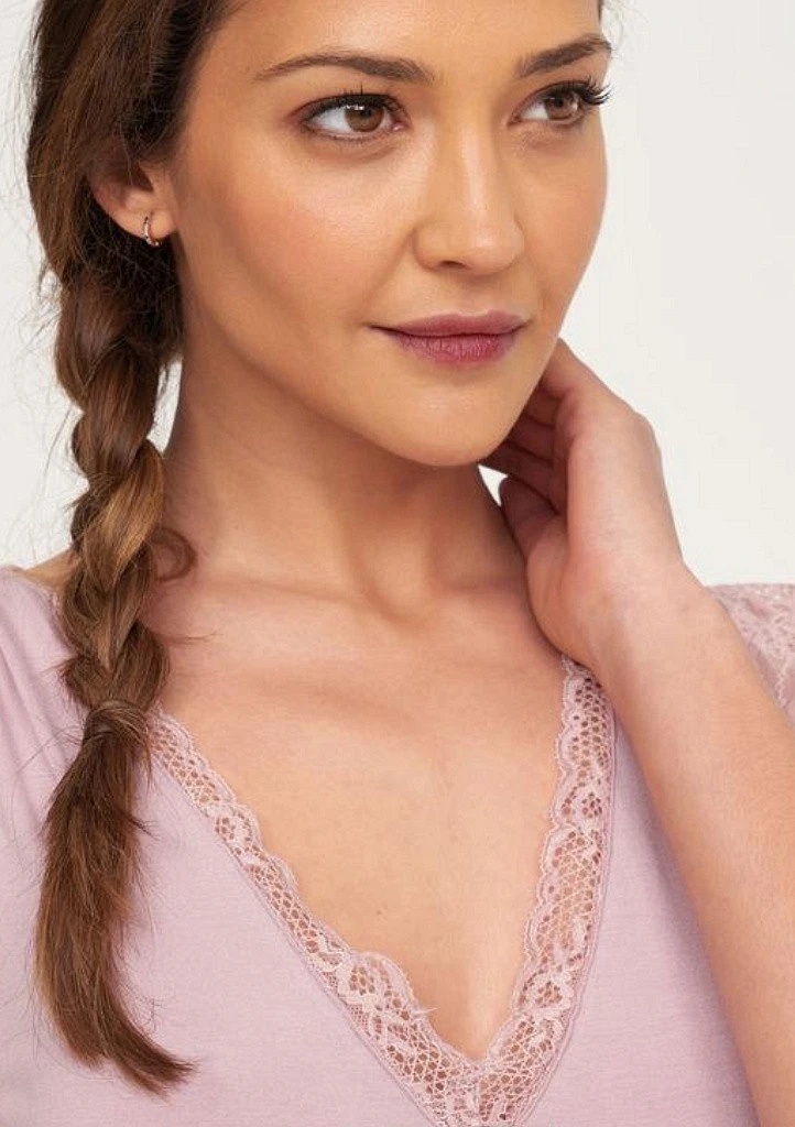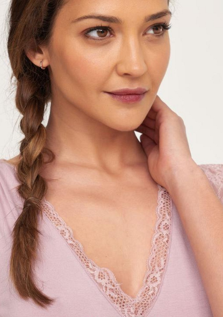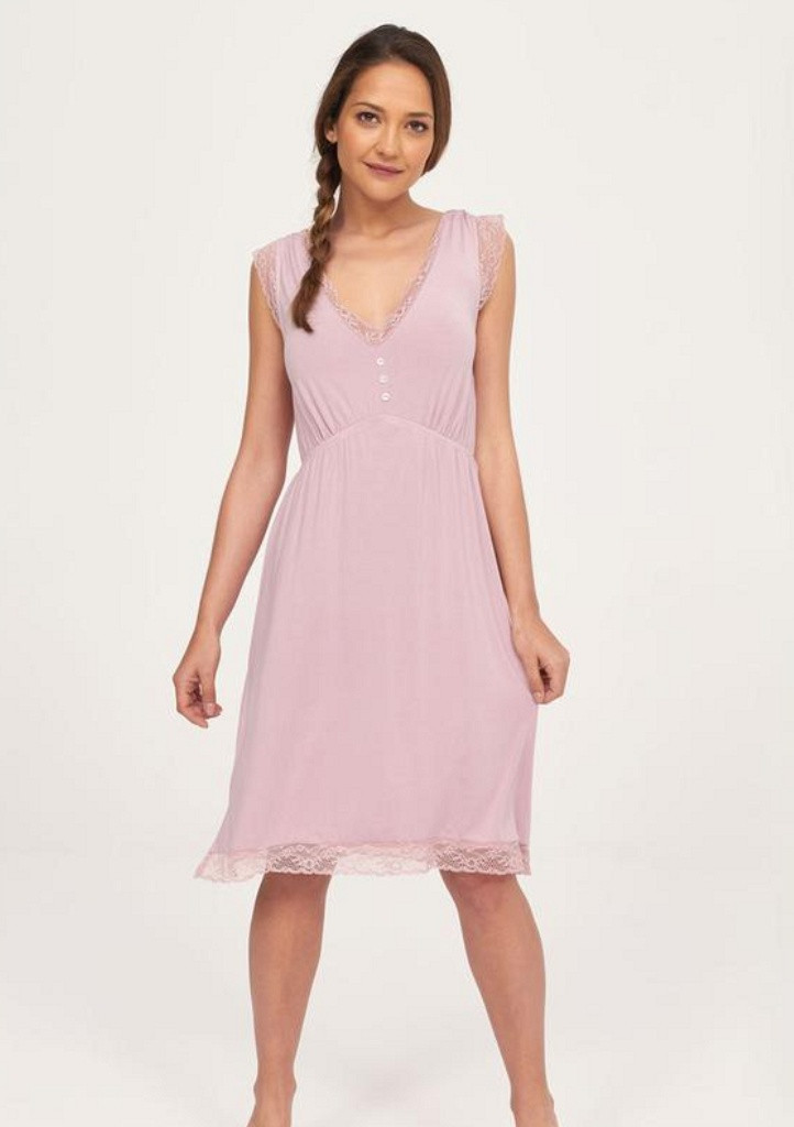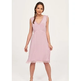 Dámská noční košile španělské značky Muydemi. Košile má výstřih do "V"éčka, který je olemovaný krajkou, pod ním jsou našité tři ozdobné knoflíky. Košile je pod prsy nabíraná a je v ní našitá gumička pro pohodlné nošení. Délka košile je nad kolena, spodní kraj je olemovaý krajkou. Košile nemá rukávy, okolo ramen je našitá krajka. Košile je velmi příjemná díky vysokému obsahu viskózy.