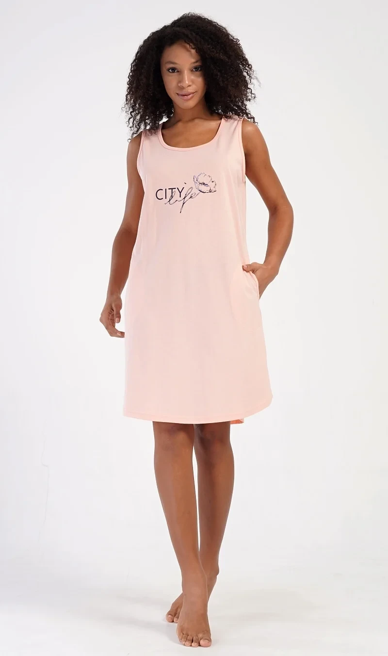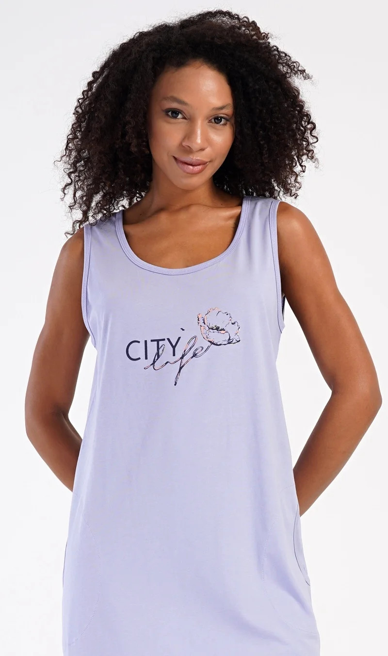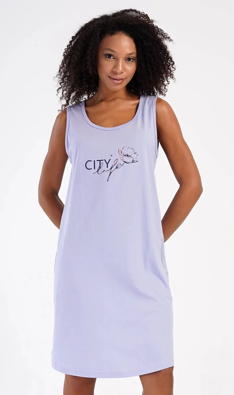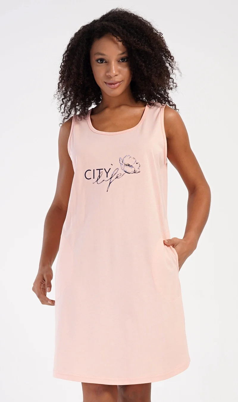 Dámská bavlněná noční košile na ramínka Agnes. Dámskou noční košilku s širšími ramínky a praktickými kapsami zdobí obrázek květu a nápis 'City life'. Jistě ji využijete i jako letní šaty nebo pohodlné domácí oblečení. Použitý materiál s obsahem bavlny 100% je příjemný a poddajný na dotek.