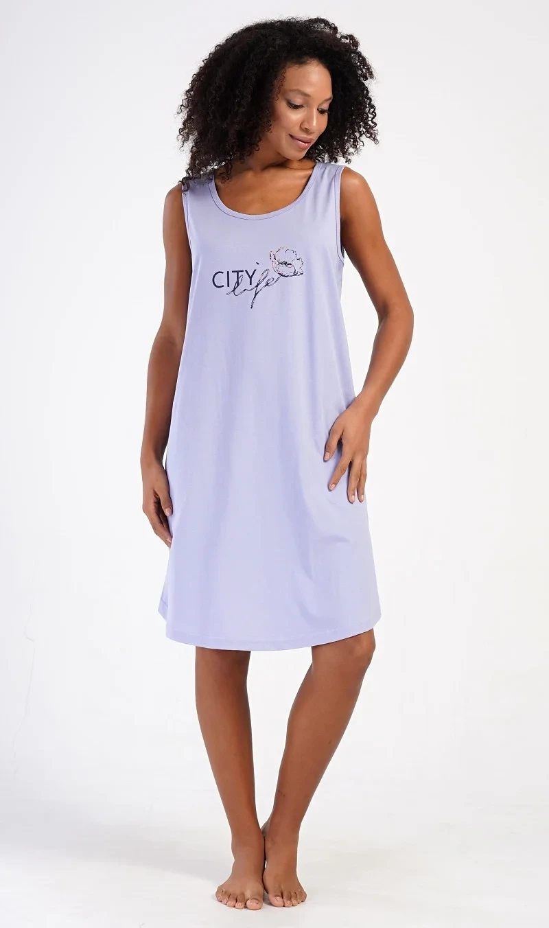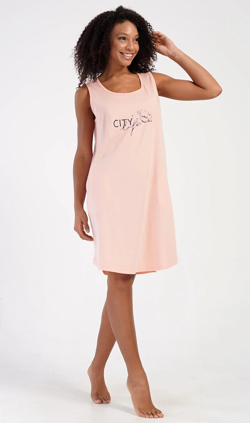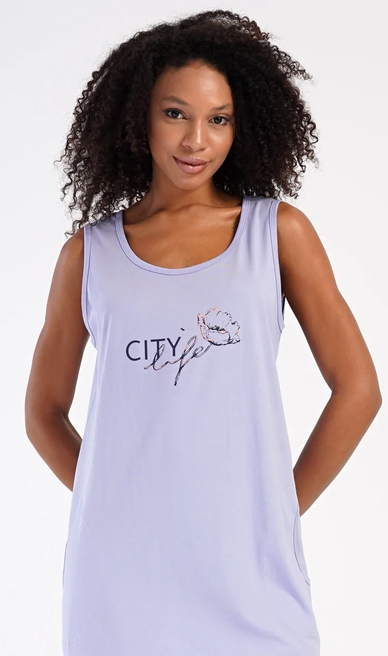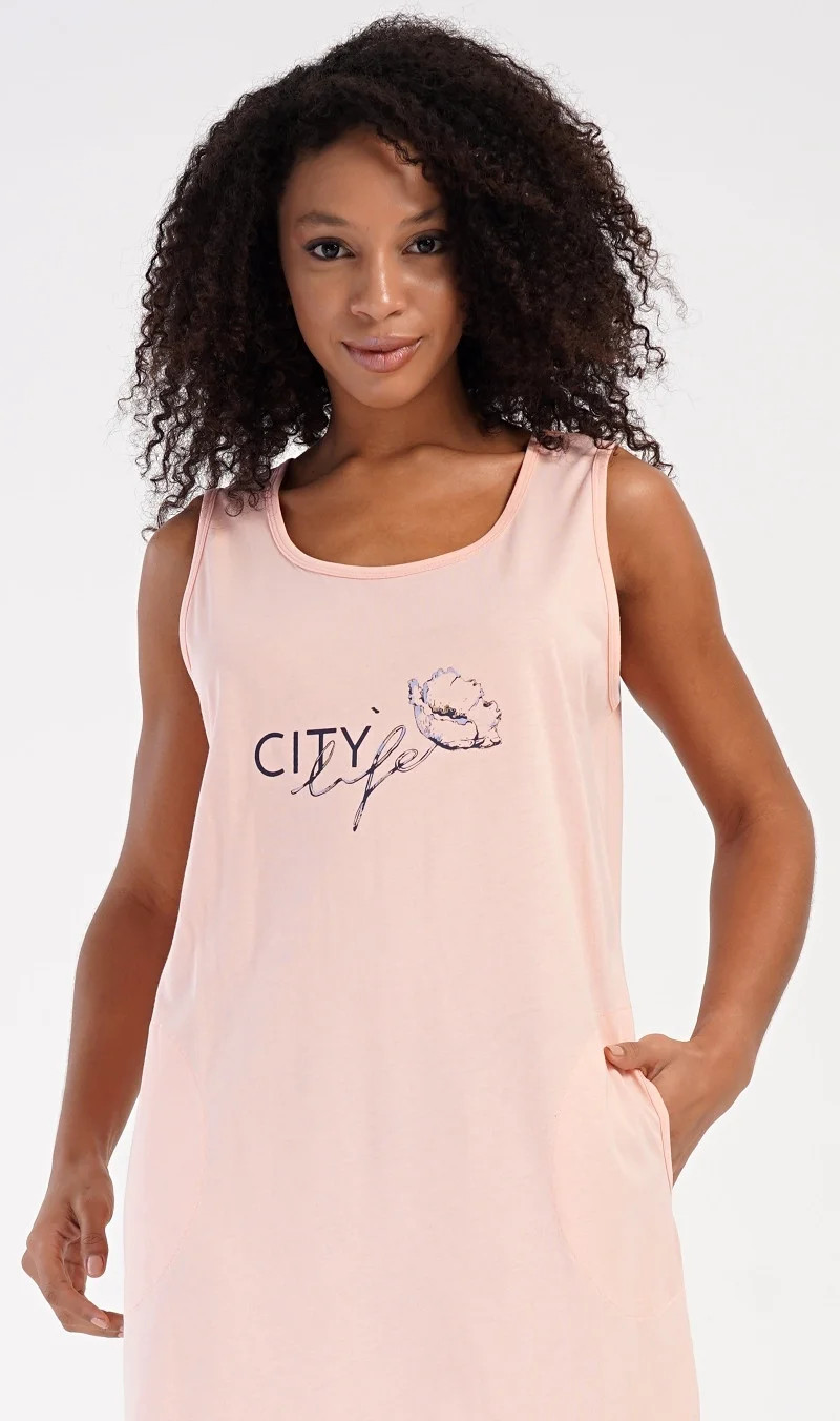 Dámská bavlněná noční košile na ramínka Agnes. Dámskou noční košilku s širšími ramínky a praktickými kapsami zdobí obrázek květu a nápis 'City life'. Jistě ji využijete i jako letní šaty nebo pohodlné domácí oblečení. Použitý materiál s obsahem bavlny 100% je příjemný a poddajný na dotek.