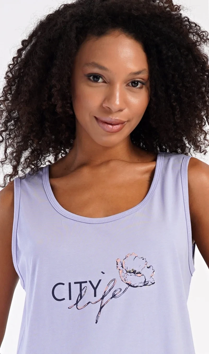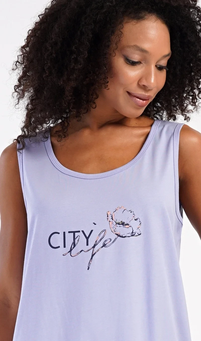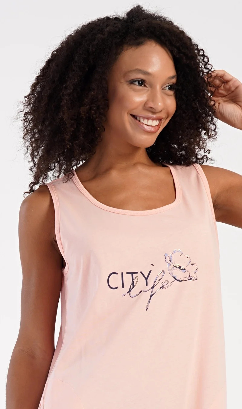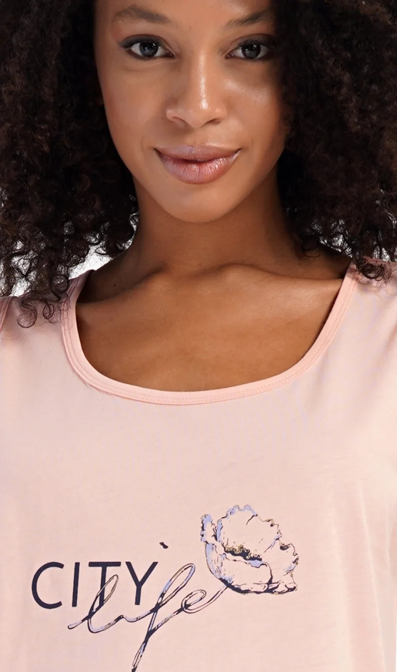 Dámská bavlněná noční košile na ramínka Agnes. Dámskou noční košilku s širšími ramínky a praktickými kapsami zdobí obrázek květu a nápis 'City life'. Jistě ji využijete i jako letní šaty nebo pohodlné domácí oblečení. Použitý materiál s obsahem bavlny 100% je příjemný a poddajný na dotek.