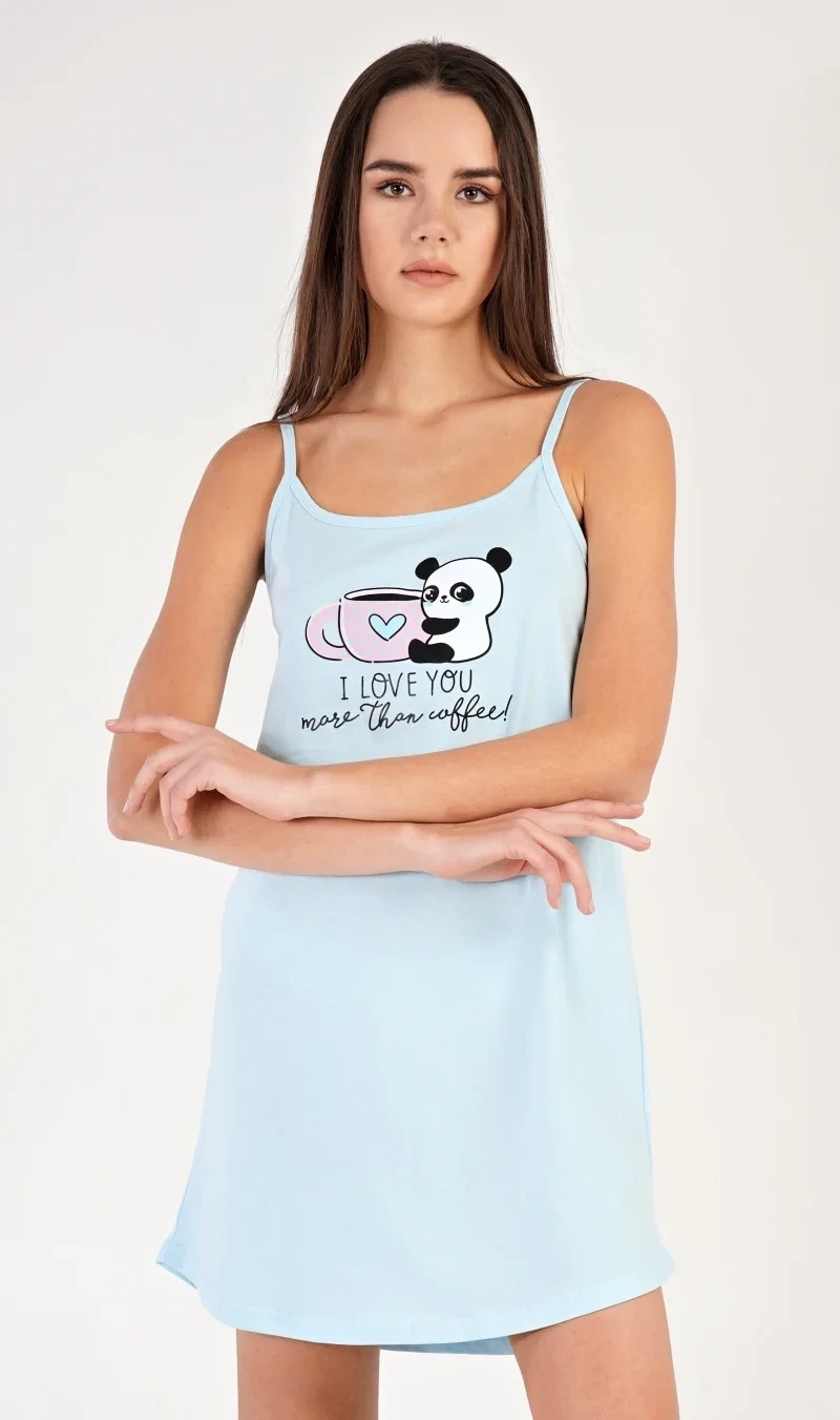 Dámská bavlněná noční košile na ramínka Coffee. Dámská noční košilka na ramínka s obrázkem pandy s šálkem kávy a nápisem 'I love you more than coffee'. Použitý materiál s obsahem bavlny 100% je příjemný a poddajný na dotek.