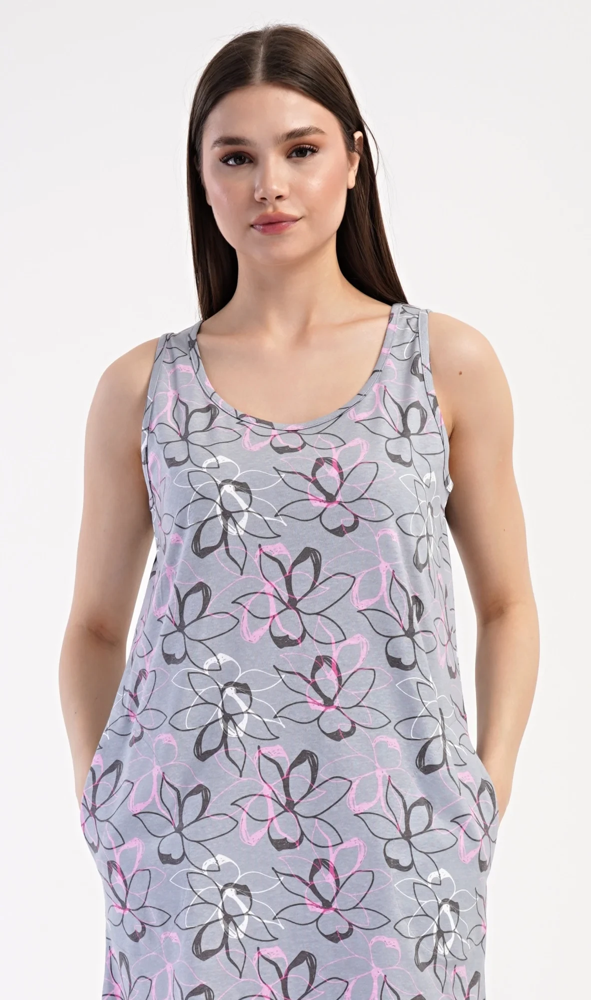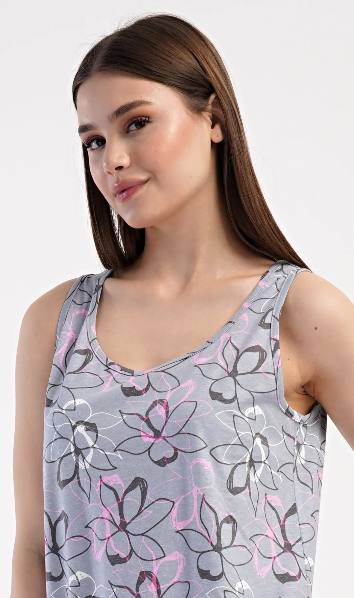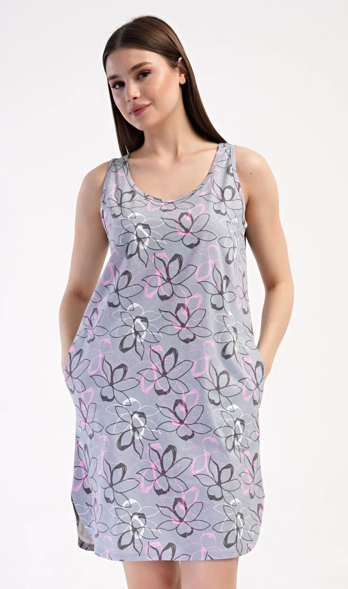 Dámská bavlněná noční košile na ramínka Mia. Noční košile se širšími ramínky a kulatým výstřihem má praktické kapsy, je potištěna květy. Použitý materiál s obsahem bavlny 100% je příjemný a poddajný na dotek. Košile je vhodná i na denní nošení, obvzlášť ji oceníte v horkých letních dnech.