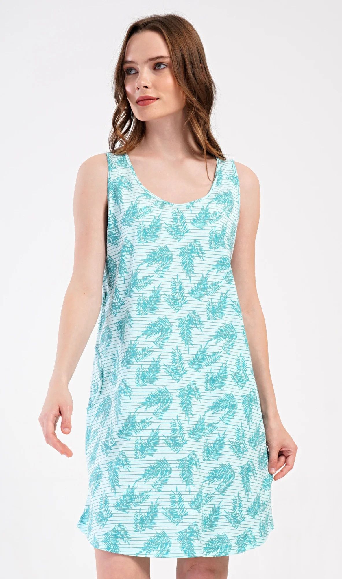 Dámská bavlněná noční košile na ramínka Simona. Noční košile se širšími ramínky a kulatým výstřihem má praktické kapsy, je potištěna větvičkami. Použitý materiál s obsahem bavlny 100% je příjemný a poddajný na dotek. Košile je vhodná i na denní nošení, obvzlášť ji oceníte v horkých letních dnech.