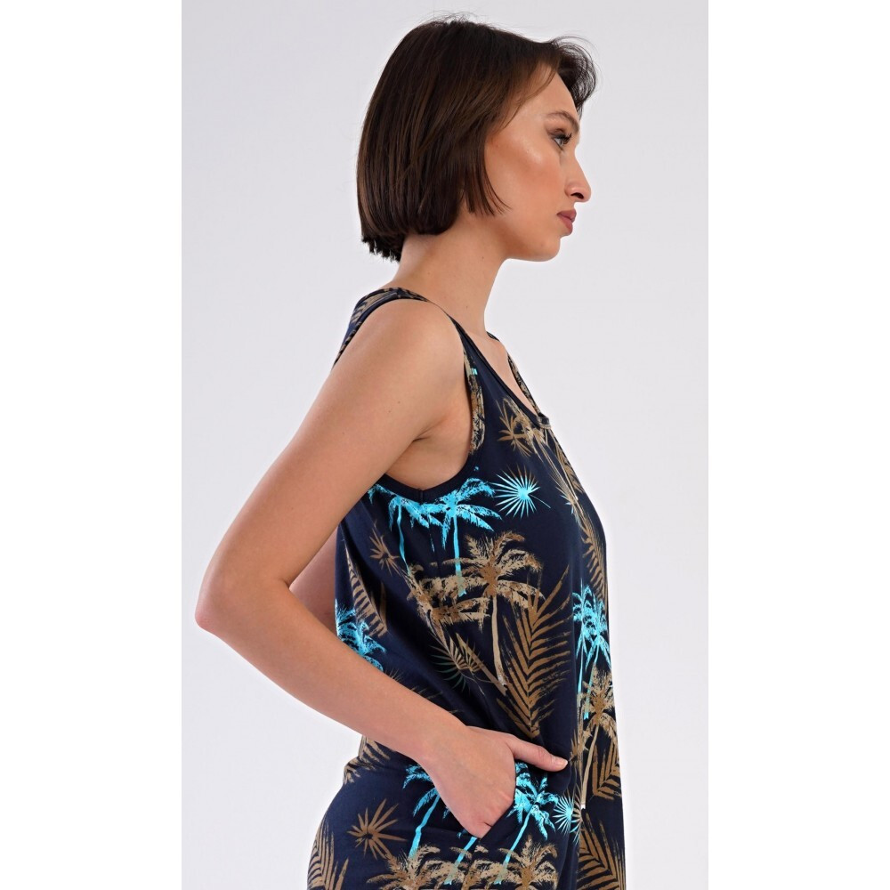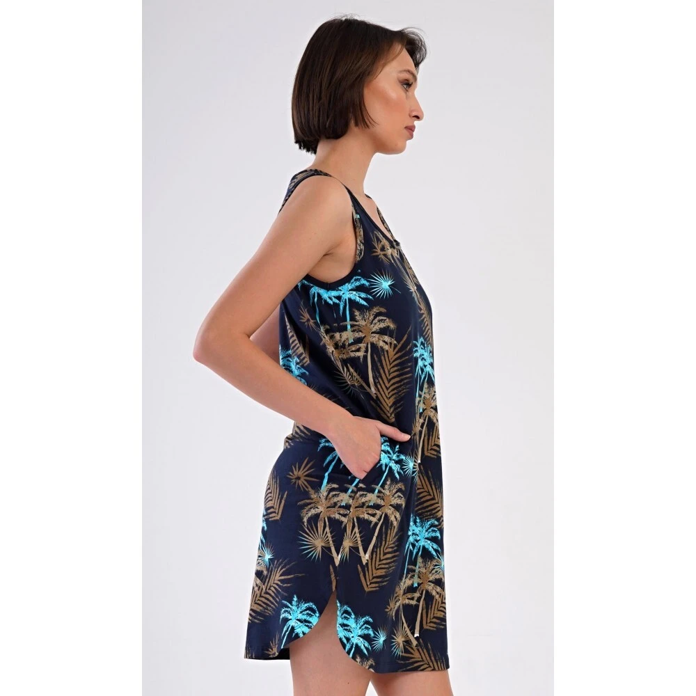 Dámská bavlněná noční košile na ramínka Tropicana. Noční košile se širšími ramínky a kulatým výstřihem má praktické kapsy, je potištěna tropickými palmami. Použitý materiál s obsahem bavlny 100% je příjemný a poddajný na dotek. Košile je vhodná i na denní nošení, obvzlášť ji oceníte v horkých letních dnech.