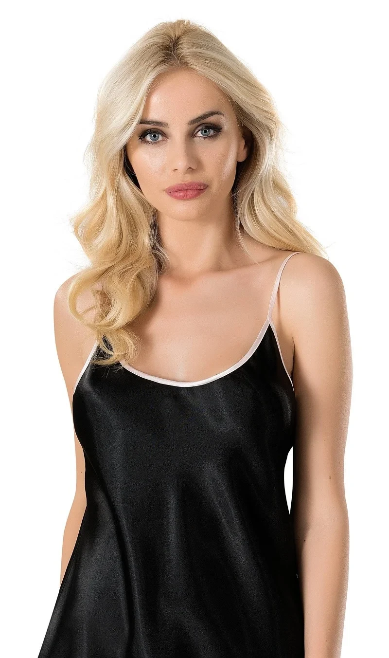 Dámská noční košilka na ramínka Paula. Černá saténová sexy košilka má lem výstřihu a ramínka v bílé barvě. Košilka je vhodná i jako dárek, je balena ve vkusné krabičce. Použitý materiál je jemný a poddajný na dotek.