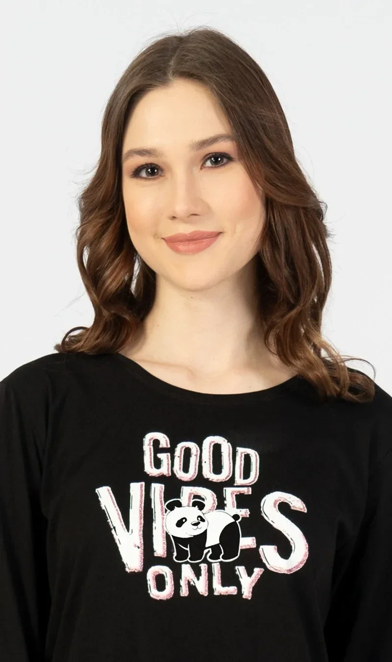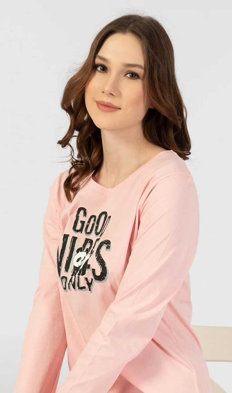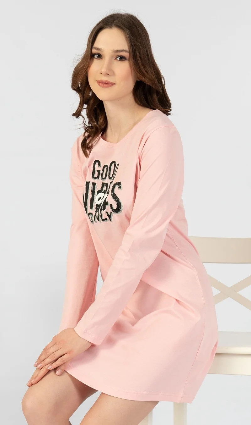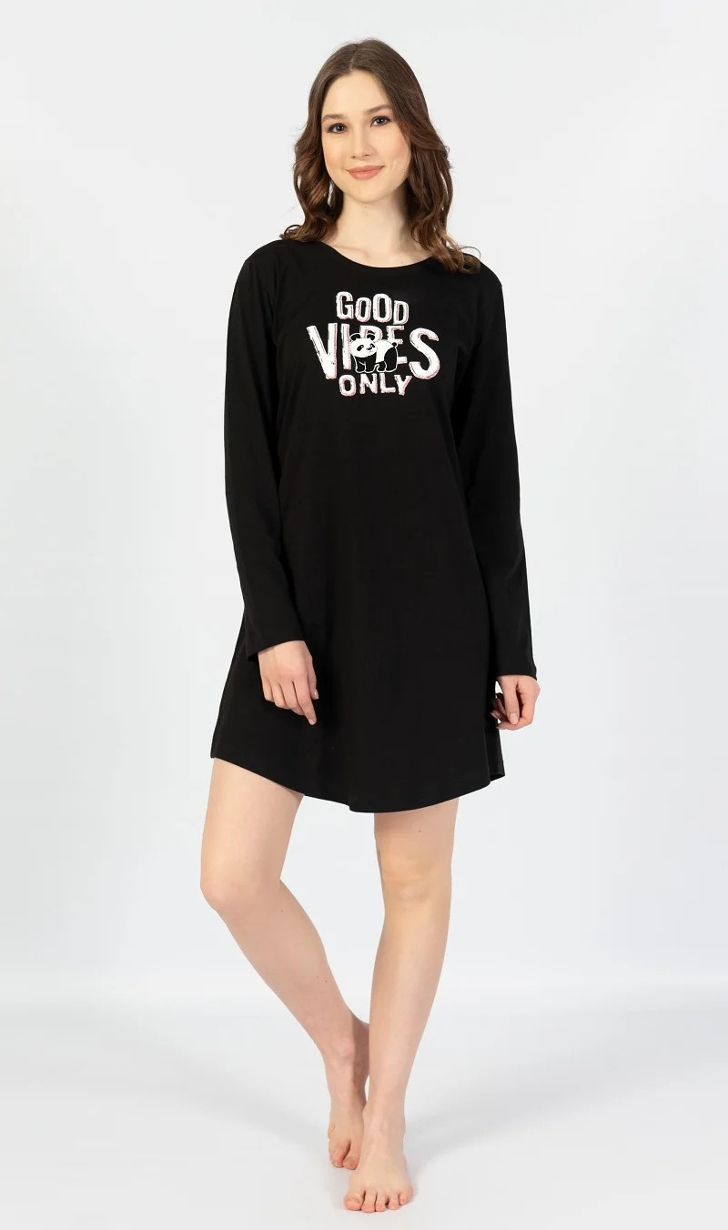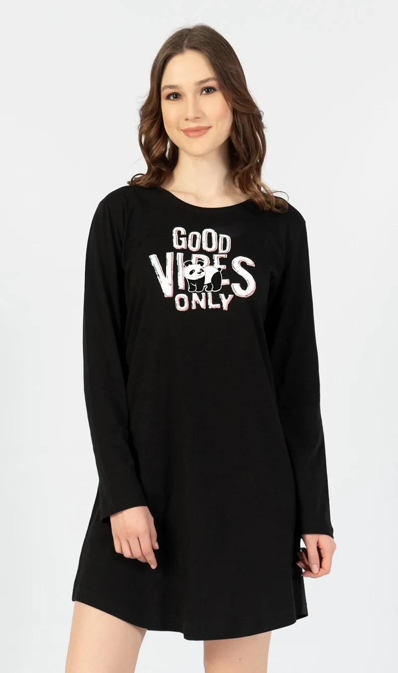 Dámská noční košile s dlouhým rukávem Good vibes. Jednobarevná dámská noční košile s dlouhým rukávem má na hrudi velký nápis Good Vibes only. Použitý materiál je jemný a poddajný na dotek.