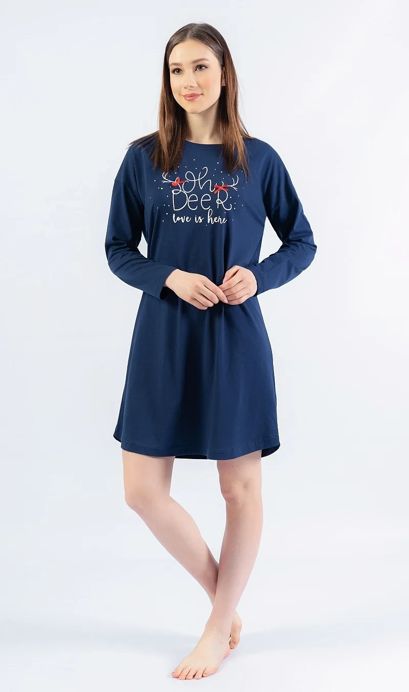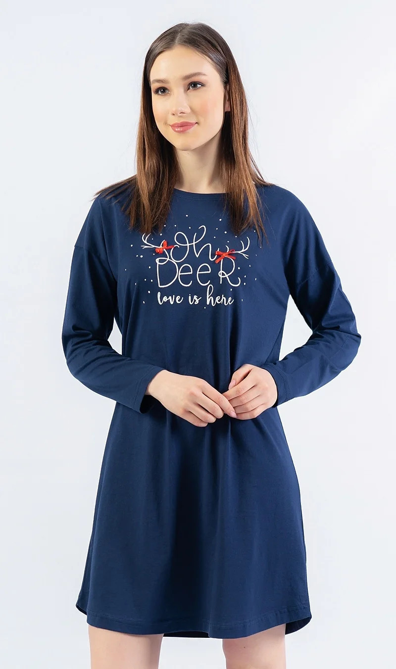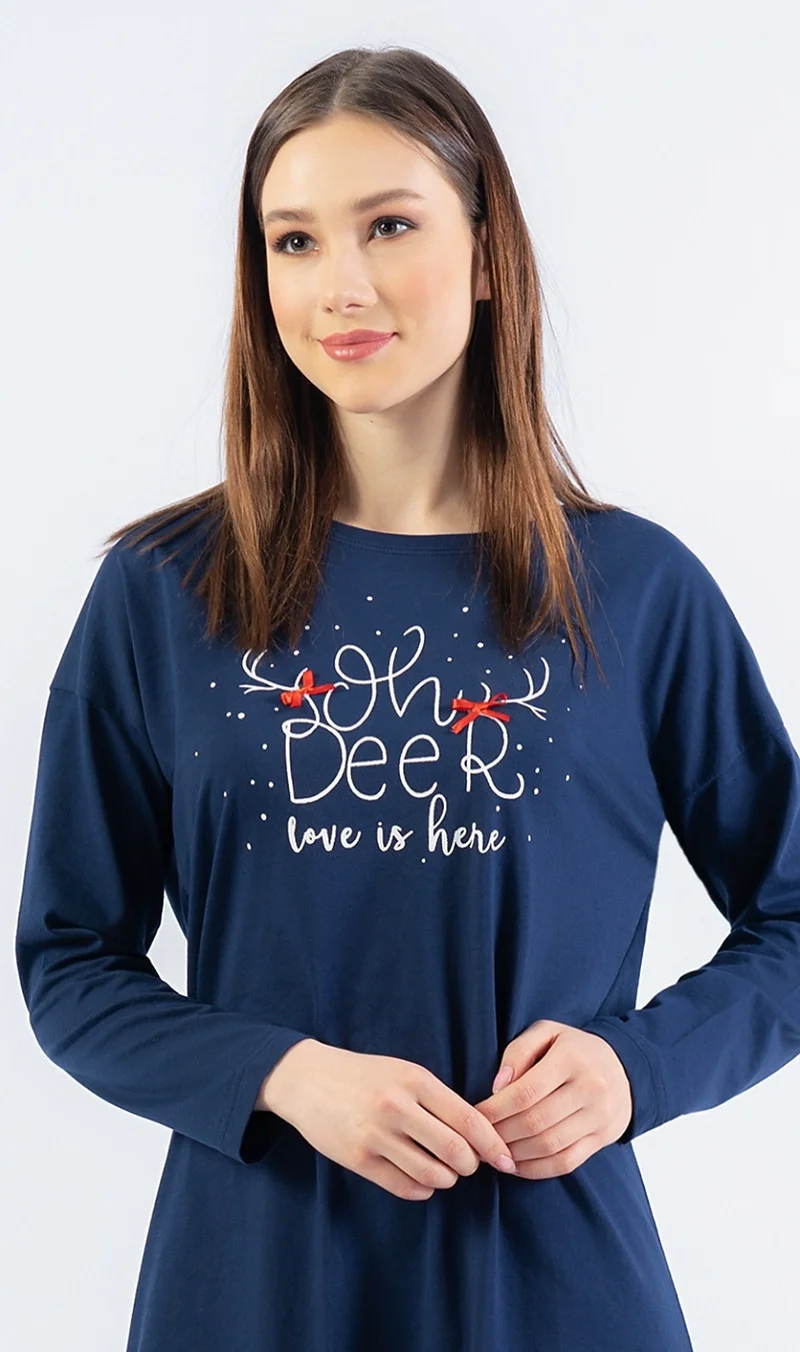 Dámská noční košile s dlouhým rukávem Oh deer. Dámská noční košile s dlouhým rukávem má na hrudi vtipný nápis Oh deer, love is here, k nápisu jsou připojeny dva jelení parůžky s plastickými červenými mašličkami. Použitý materiál je jemný a poddajný na dotek. Košile je vhodná i na denní nošení.