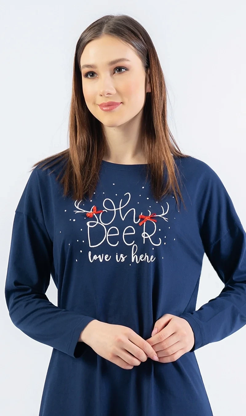 Dámská bavlněná noční košile s dlouhým rukávem Oh deer. Noční košile má na hrudi nápis 'Oh deer, love is here'. K nápisu jsou připojeny dva jelení parůžky a červené mašličky. Použitý bavlněný materiál je příjemný a poddajný na dotek.