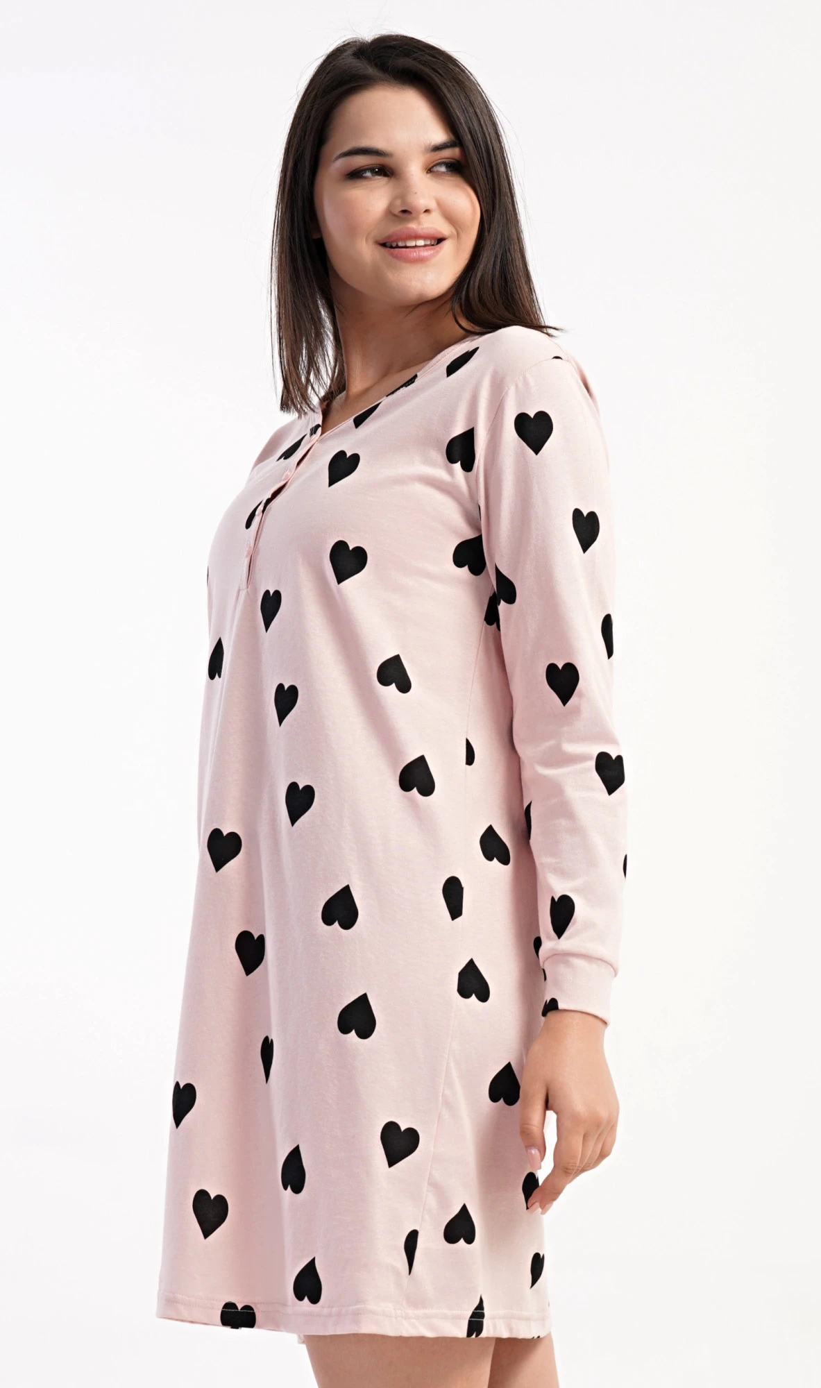 Dámská bavlněná noční košile s dlouhým rukávem Srdce. Noční košile s kulatým výstřihem a légou na knoflíčky má příjemnou délku nad kolena. Látka košile je potištěna srdíčky, dlouhý tukáv je zakončen manžetou. Použitý materiál s podílem bavlny 100% je příjemný a poddajný na dotek.