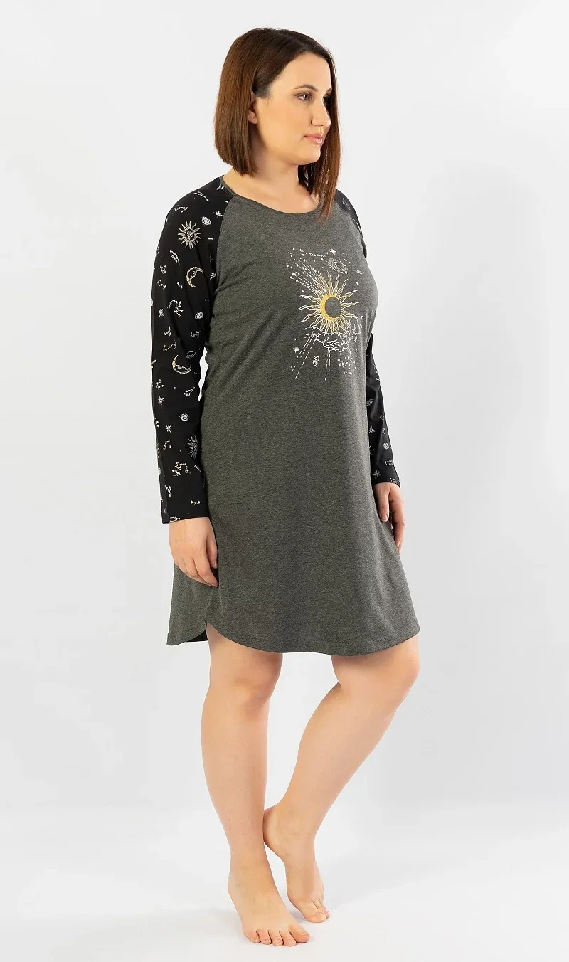 Dámská noční košile s dlouhým rukávem The moon. Noční košile má na hrudi obrázek měsíce. Astro motivy se opakují i na rukávech. Použitý materiál s obsahem bavlny 70% je příjemný a poddajný na dotek.