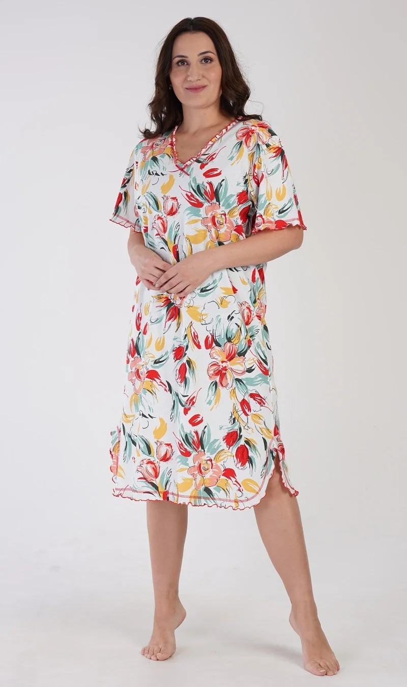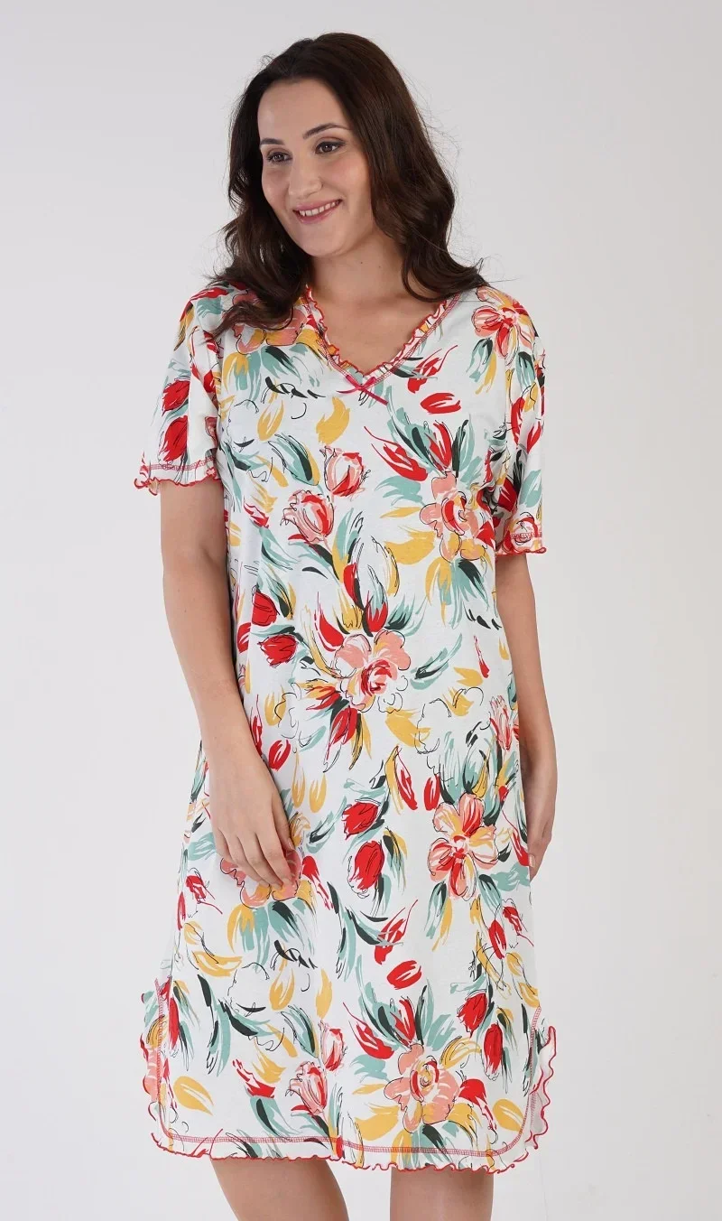 Dámská bavlněná noční košile s krátkým rukávem Alex. Noční košile pro všechny milovníky retra a starých časů s příjemnou délkou pod kolena má ozdobné žlábkování kolem výstřihu, rukávů a spodního lemu. Na látce košile jsou natištěny florální motivy. Použitý bavlněný materiál je příjemný a poddajný na dotek.