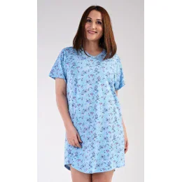 Dámská bavlněná noční košile s krátkým rukávem Bára. Dámská noční košile s příjemnou délkou nad kolena má malý výstřih do V a lemovku kolem výstřihu. Na světle modrém podkladu jsou natištěny jemné květy a listy. Použitý materiál s obsahem bavlny 100% je příjemný a poddajný na dotek.