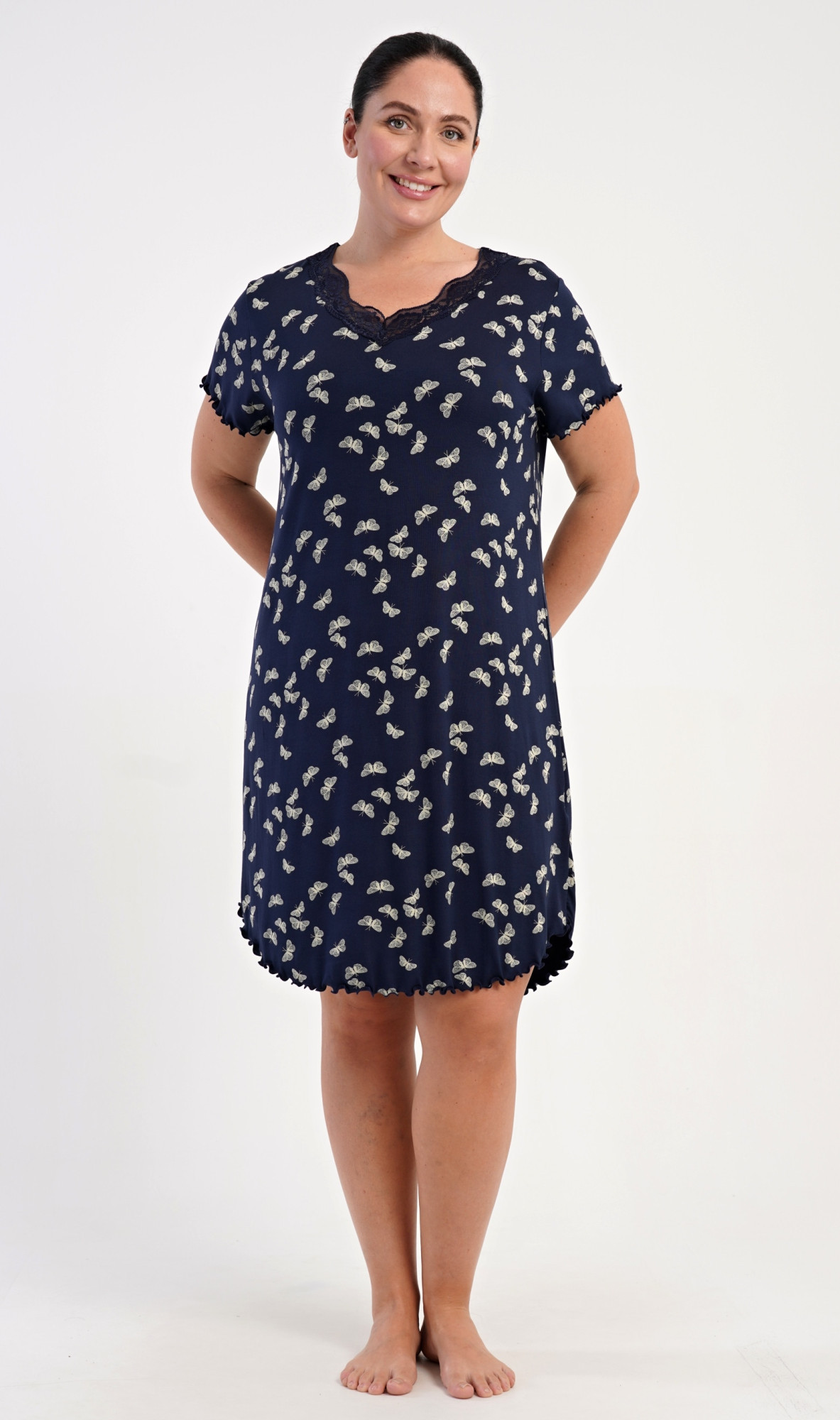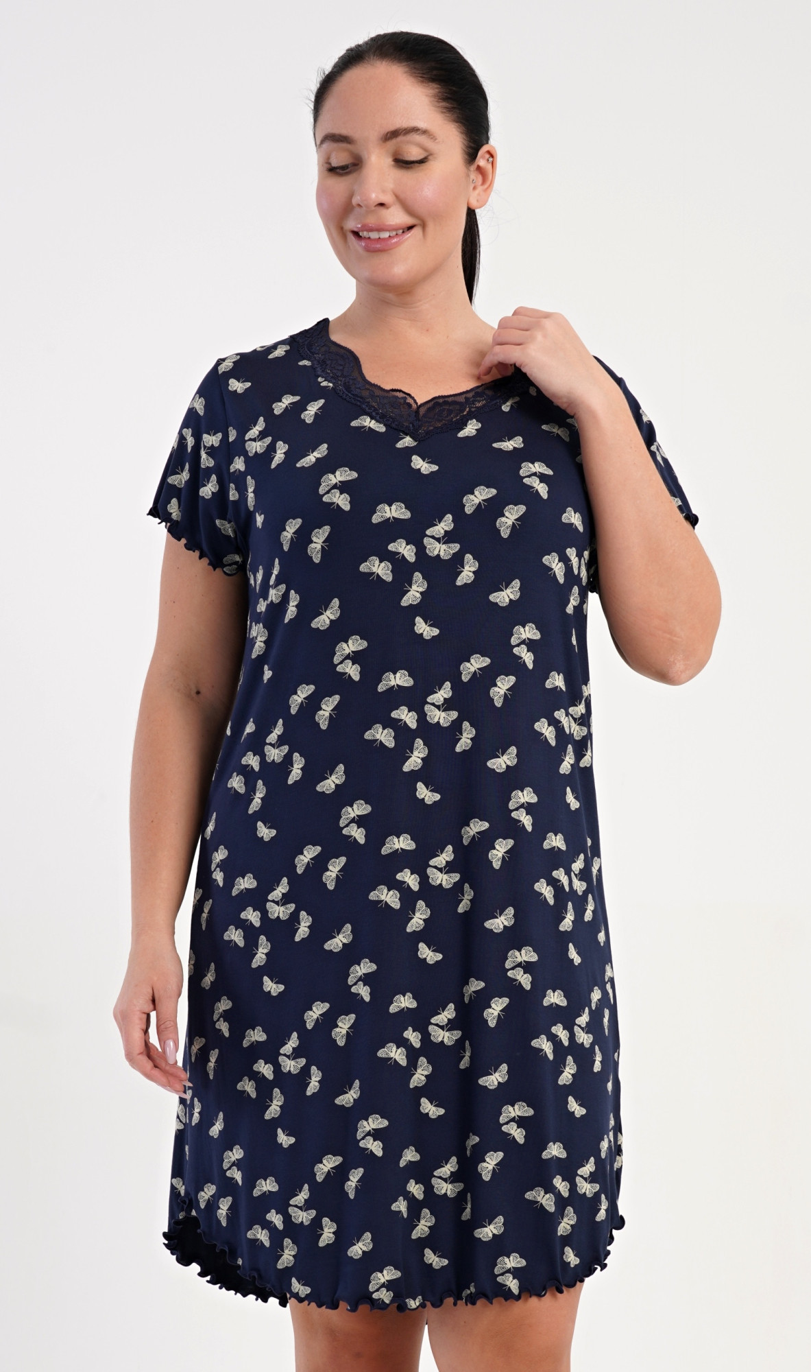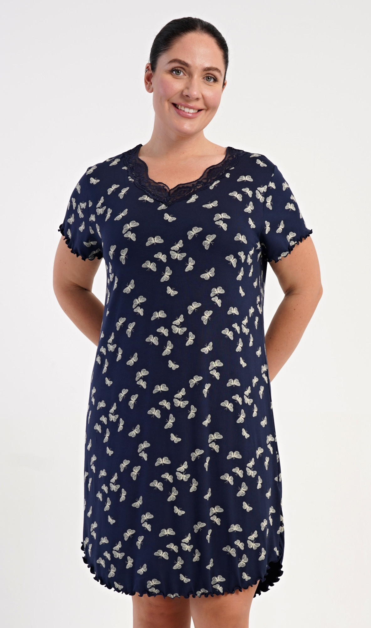 Dámská noční košile s krátkým rukávem Butterflies. Noční košile s příjemnou délkou po kolena má žlábkování na rukávech a spodním lemu, výstřih je ozdoben krajkou. Látka košile je potištěna drobnými motýlky. Použitý viskózový materiál s příměsí lycry je příjemný a poddajný na dotek.