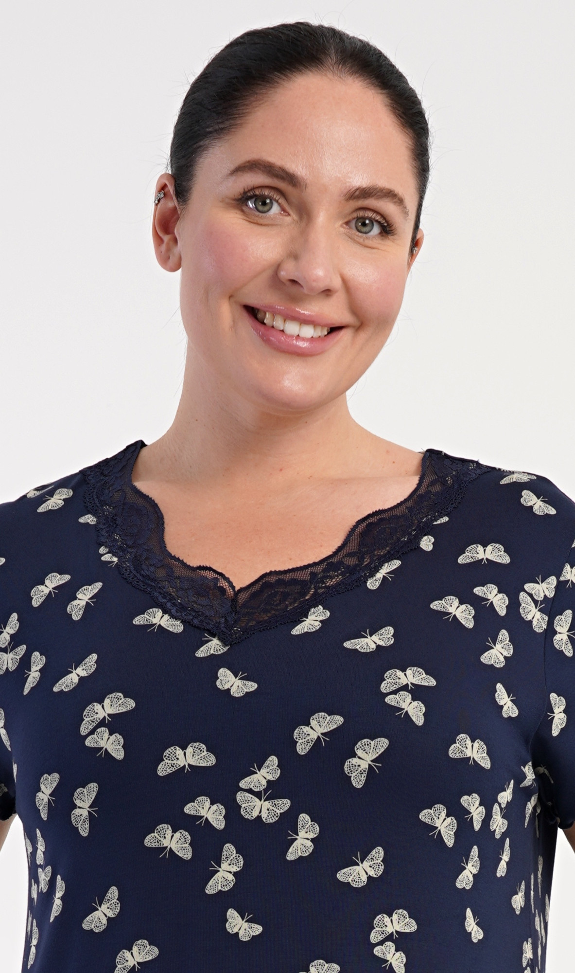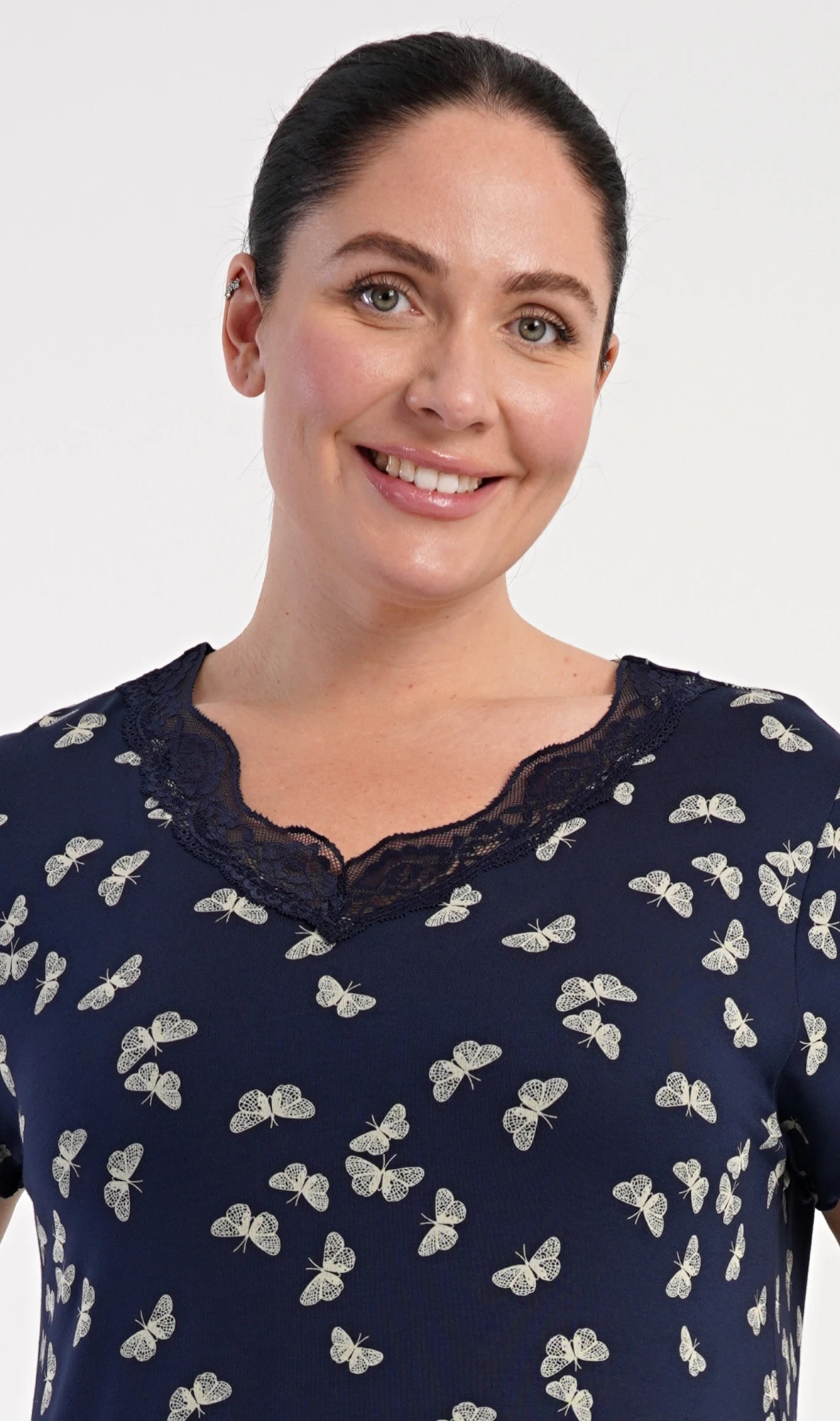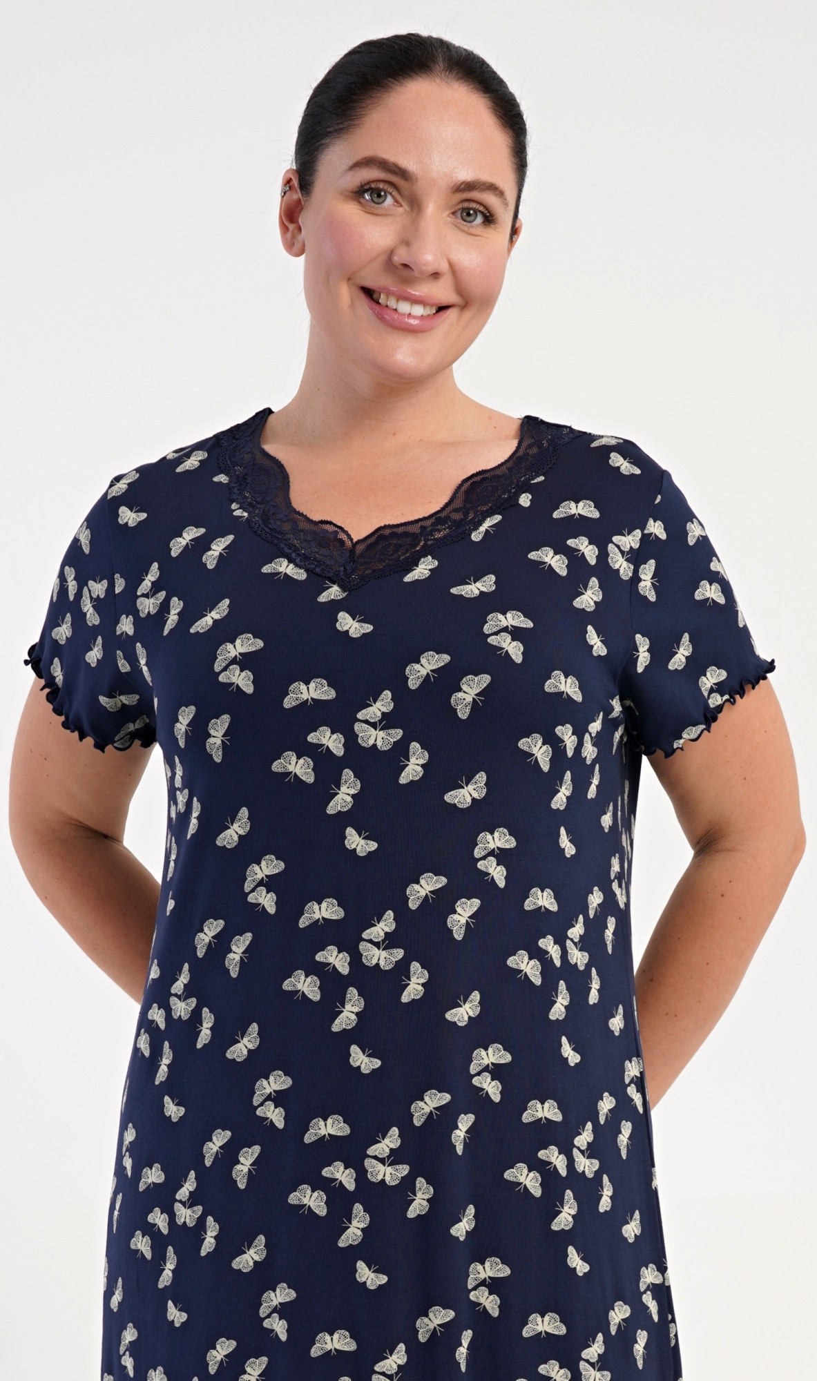 Dámská noční košile s krátkým rukávem Butterflies. Noční košile s příjemnou délkou po kolena má žlábkování na rukávech a spodním lemu, výstřih je ozdoben krajkou. Látka košile je potištěna drobnými motýlky. Použitý viskózový materiál s příměsí lycry je příjemný a poddajný na dotek.