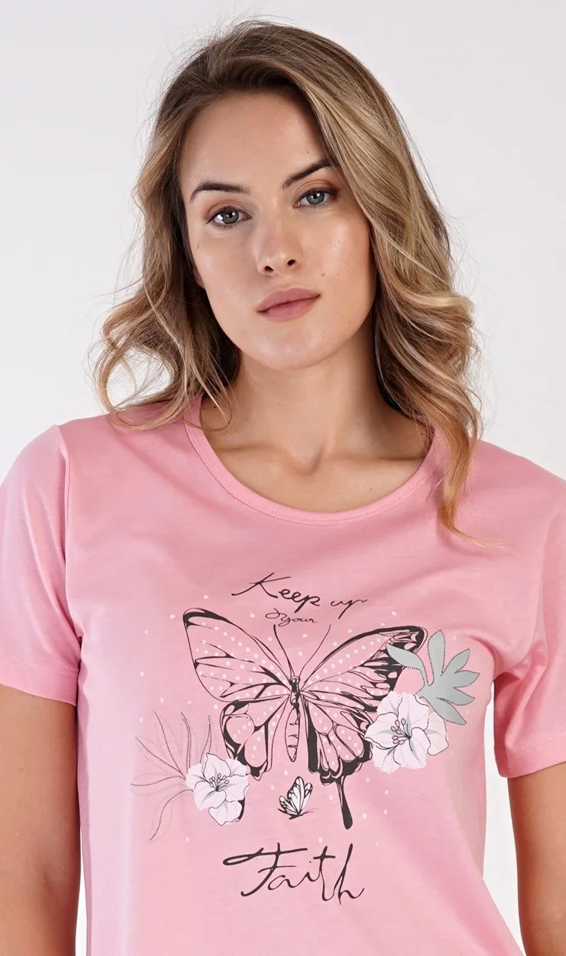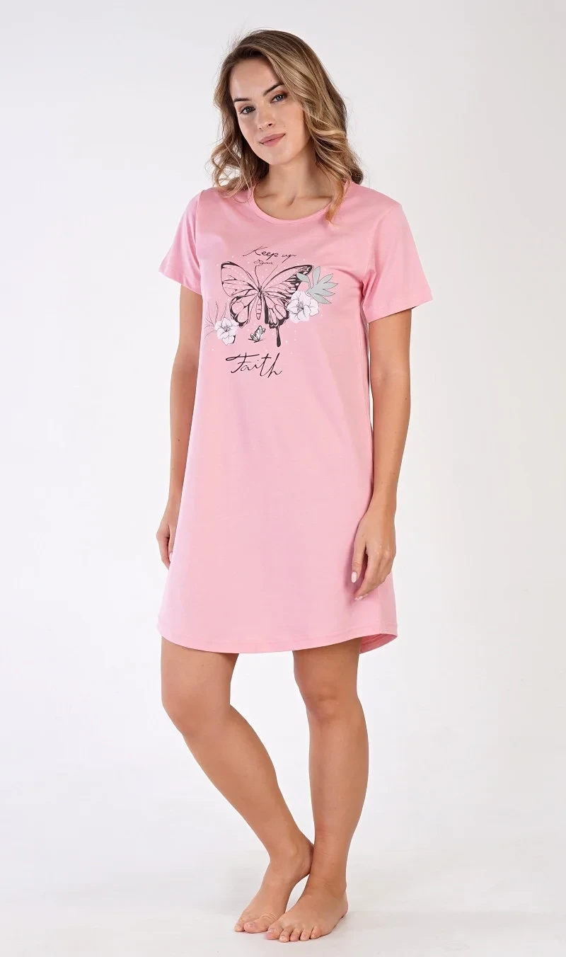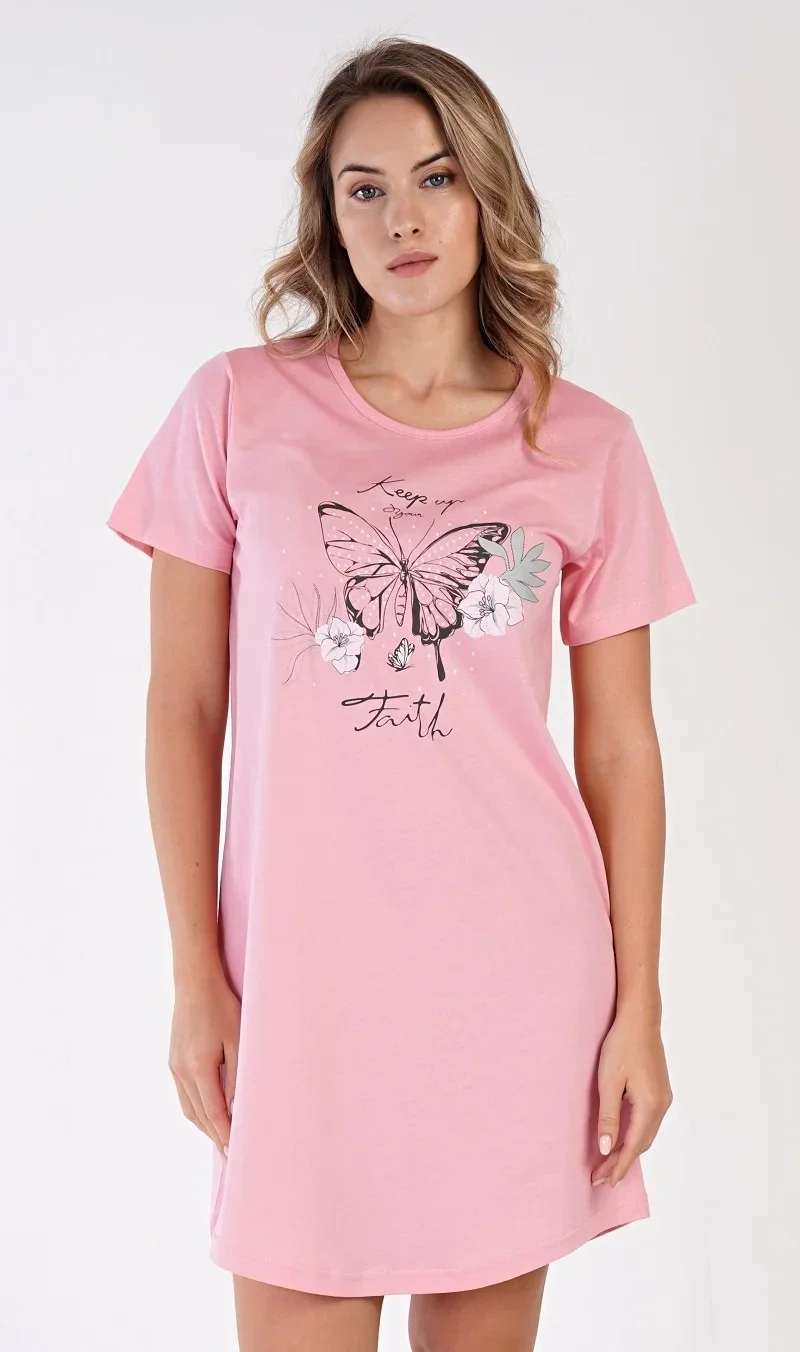 Dámská bavlněná noční košile s krátkým rukávem Butterfly. Dámská noční košile s kulatým výstřihem je jednobarevná, na hrudi má nápis 'Keep up your faith' a obrázek motýla. Použitý materiál s obsahem bavlny 100% je příjemný a poddajný na dotek.