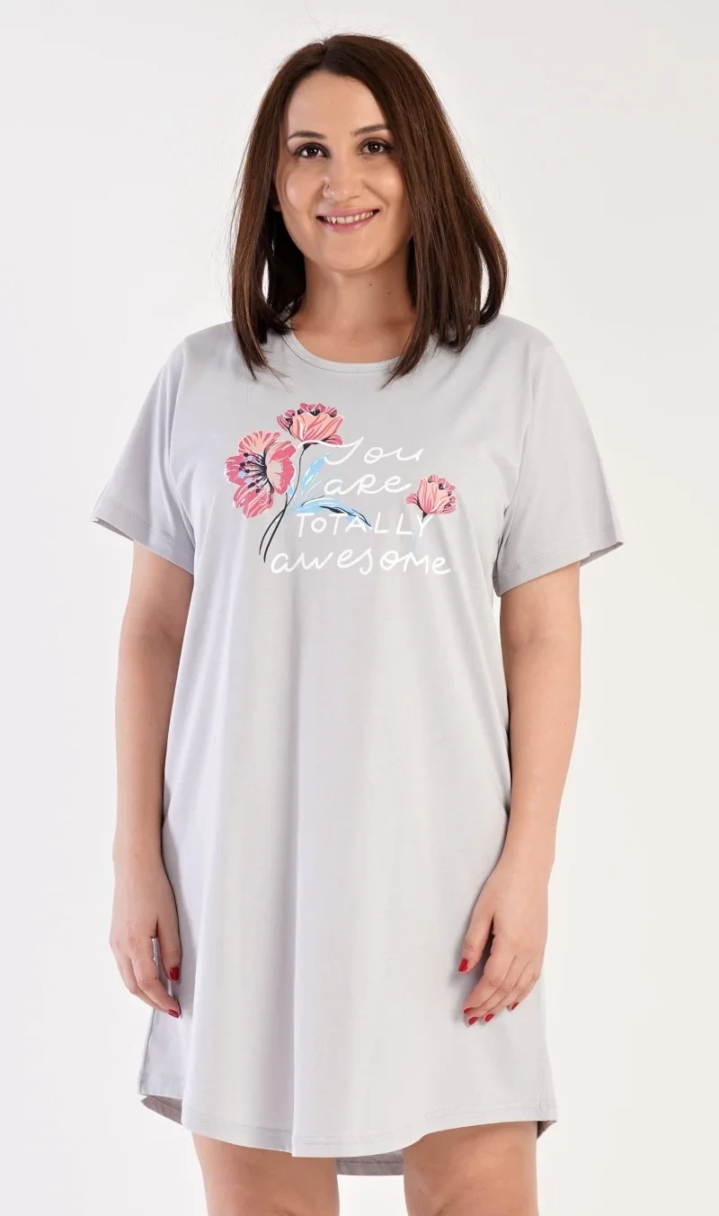 Dámská noční košile s krátkým rukávem Casandra. Noční košile s kulatým výstřihem má na hrudi obrázek květů a nápis 'You are totally awesome'. Použitý materiál je příjemný a poddajný na dotek. Obsah bavlny u korálové barvy je 100% a u světle šedé 70%.