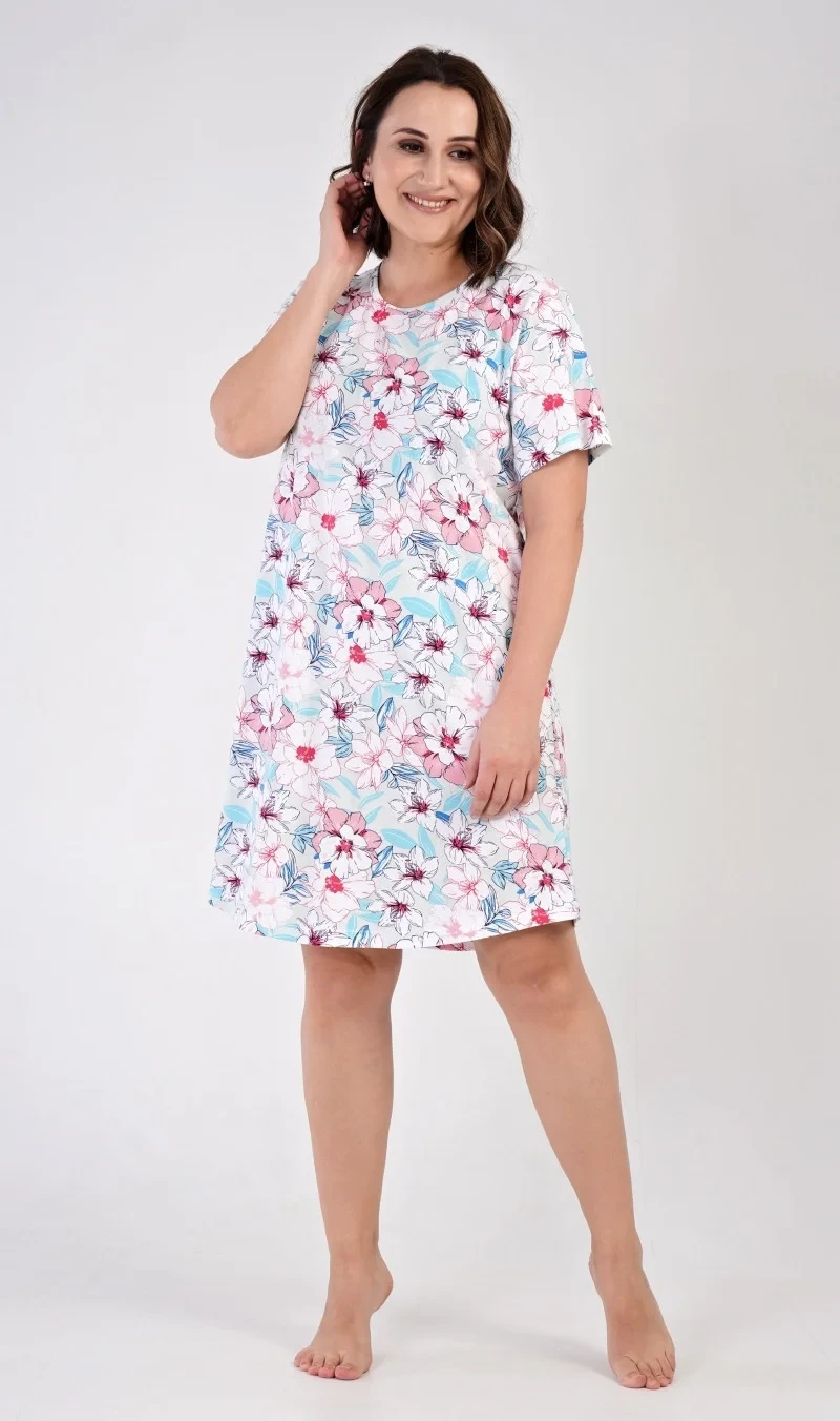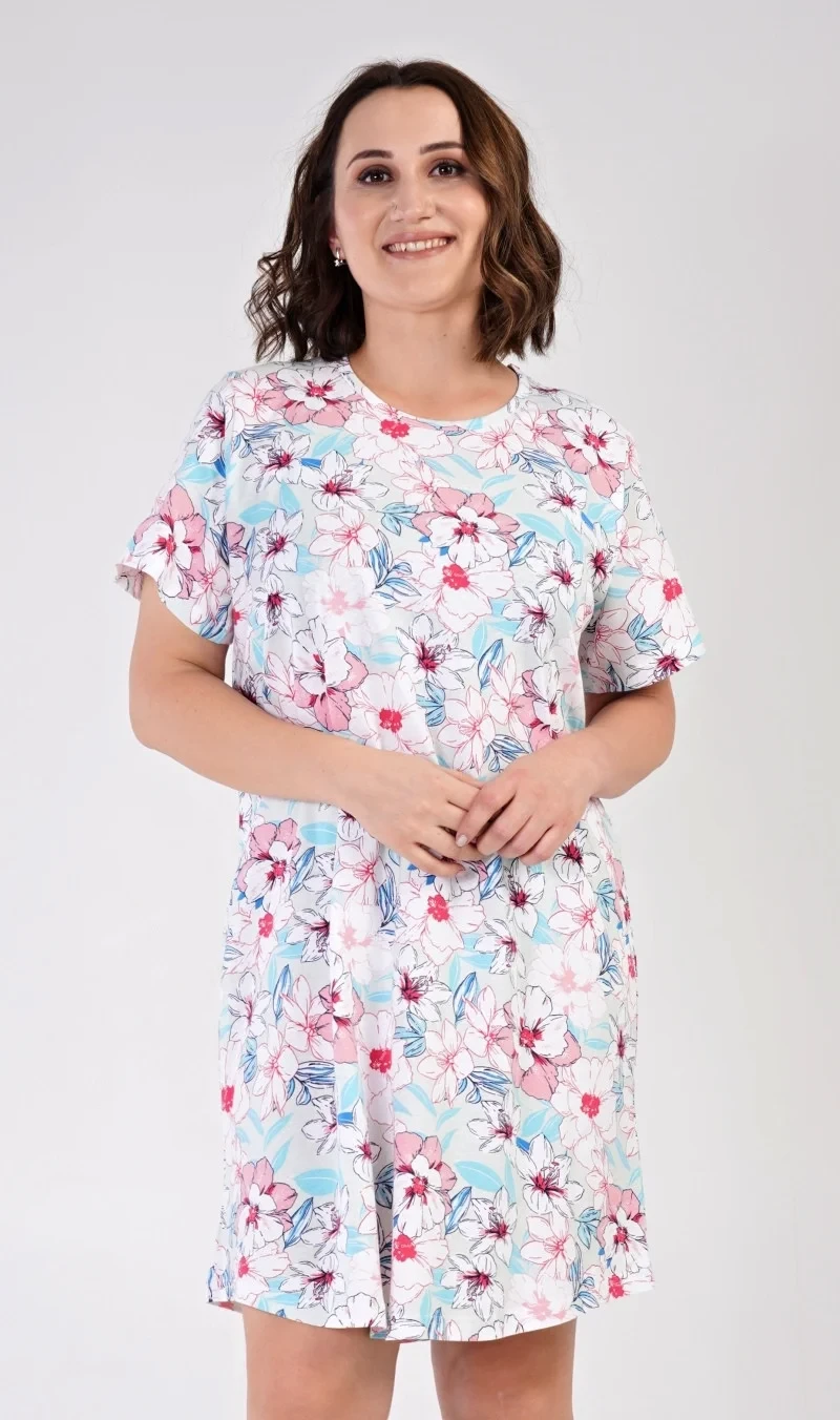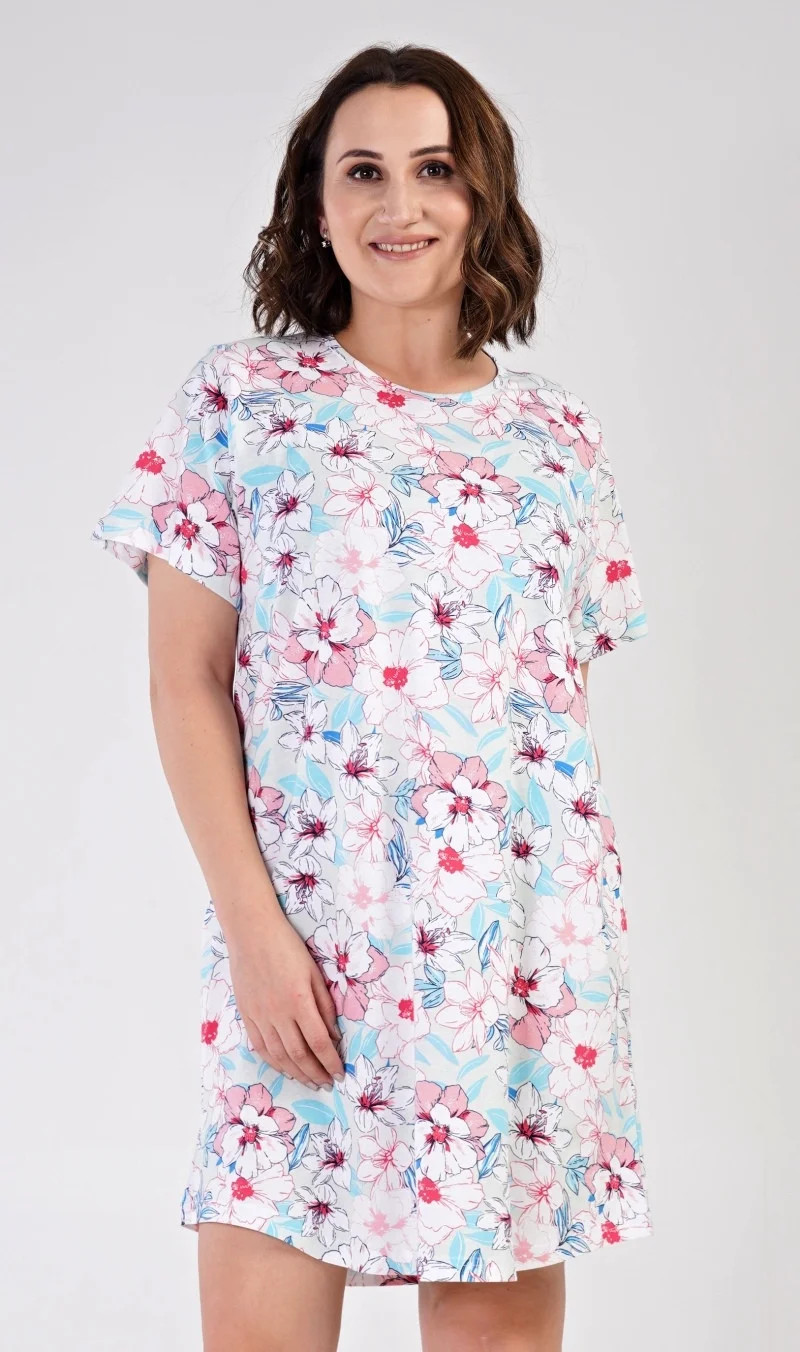 Dámská bavlněná noční košile s krátkým rukávem Elen. Dámská noční košilka s příjemnou délkou nad kolena má kulatý výstřih. Na látce košile jsou natištěny květinové motivy. Použitý bavlněný materiál je jemný a poddajný na dotek.