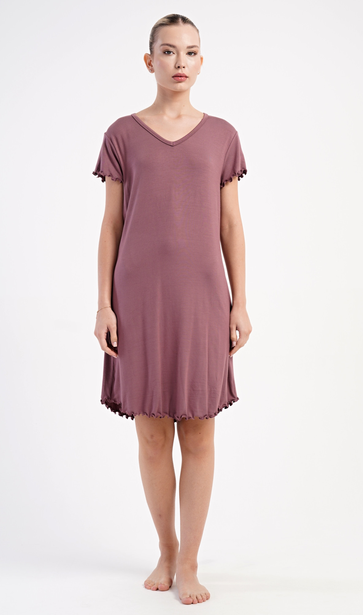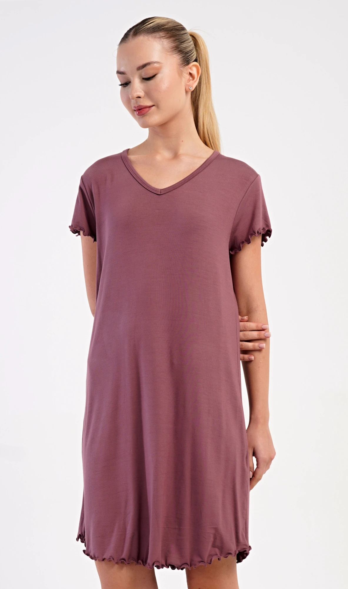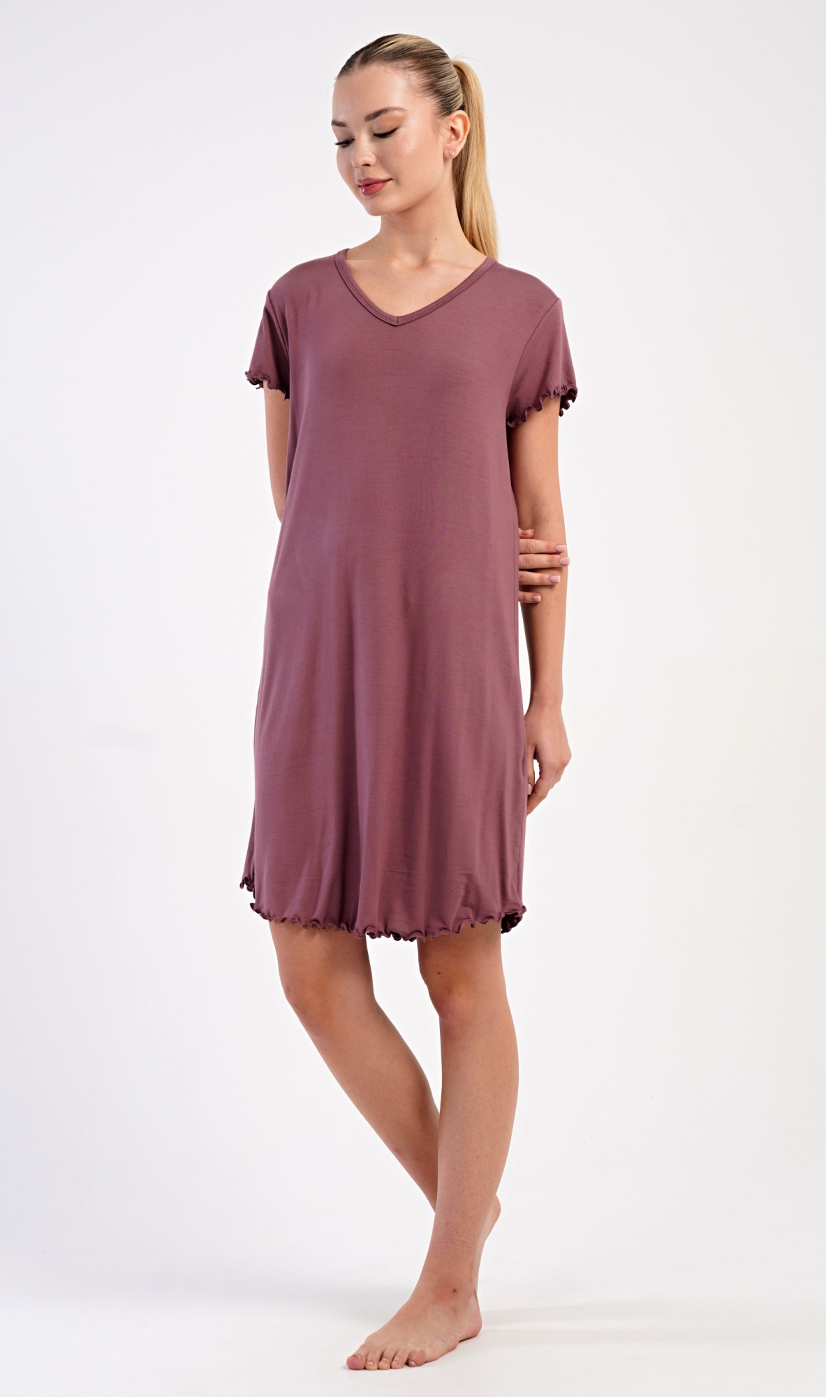 Dámská bavlněná noční košile s krátkým rukávem Eliza. Košile má příjemnou délkou nad kolena a výstřih do V, je ozdobena žlábkováním na rukávech a spodním lemu. Použitý materiál s podílem bavlny 95% je příjemný a poddajný na dotek.