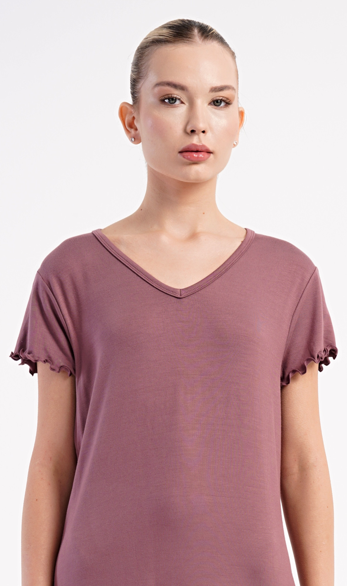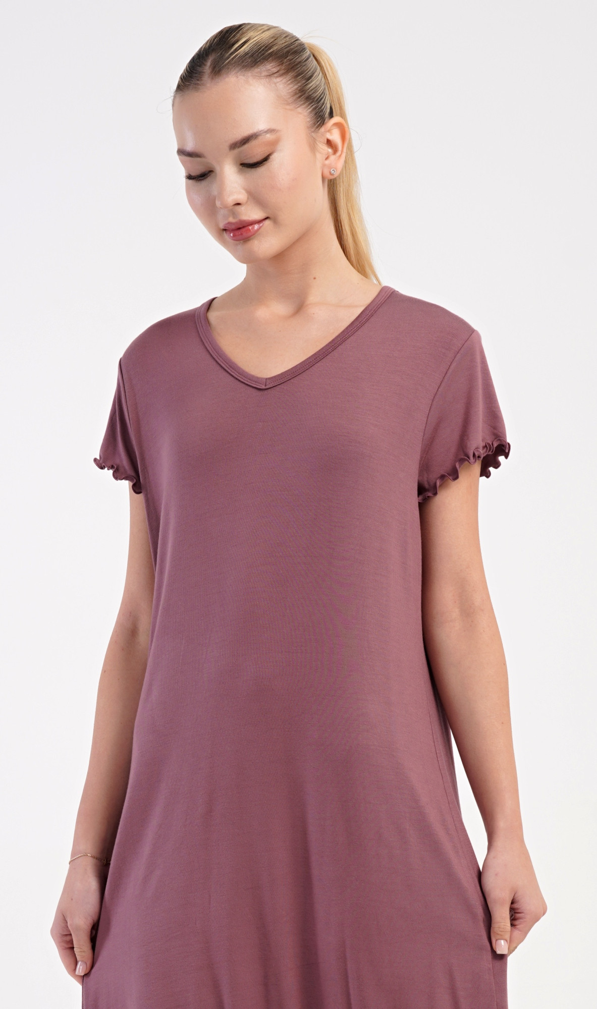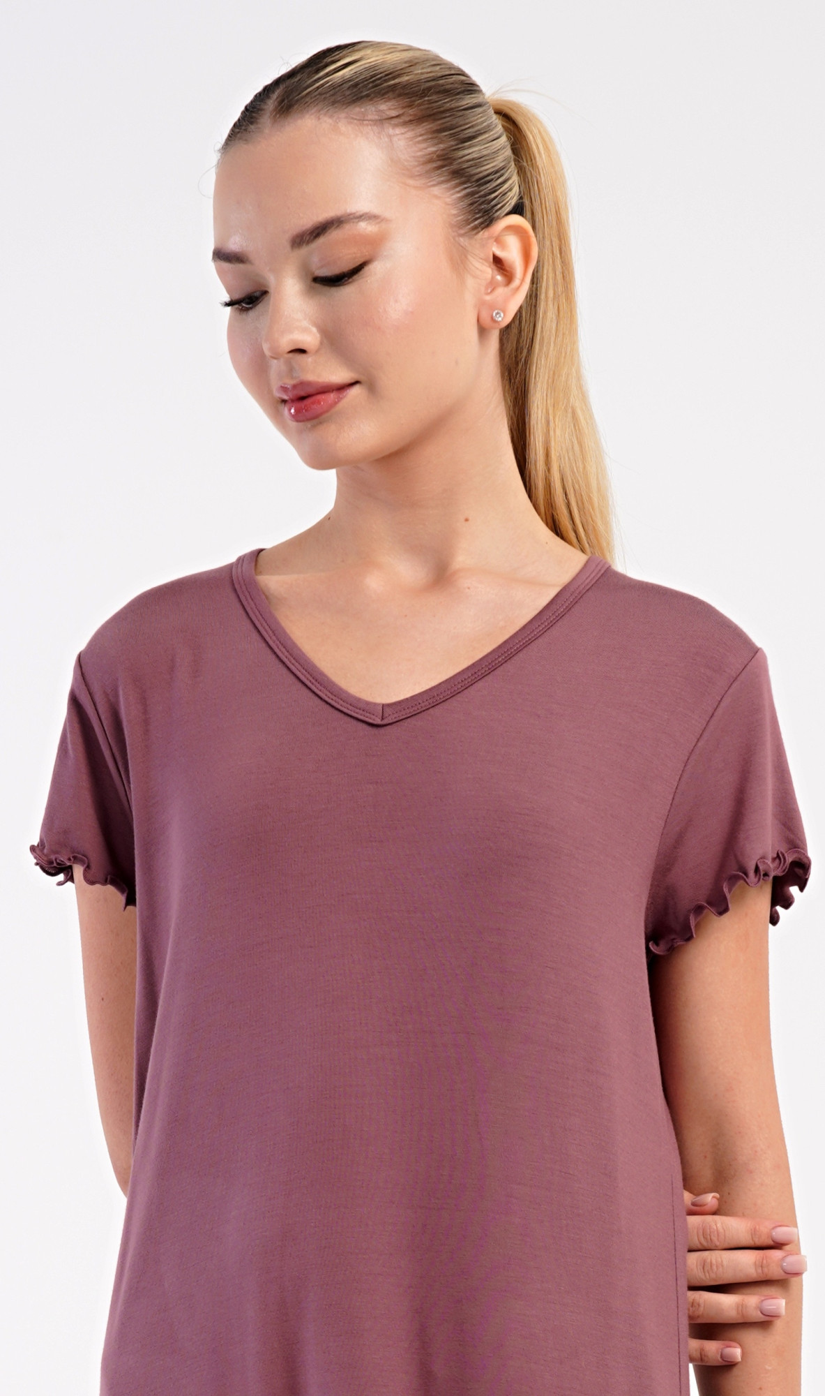 Dámská bavlněná noční košile s krátkým rukávem Eliza. Košile má příjemnou délkou nad kolena a výstřih do V, je ozdobena žlábkováním na rukávech a spodním lemu. Použitý materiál s podílem bavlny 95% je příjemný a poddajný na dotek.