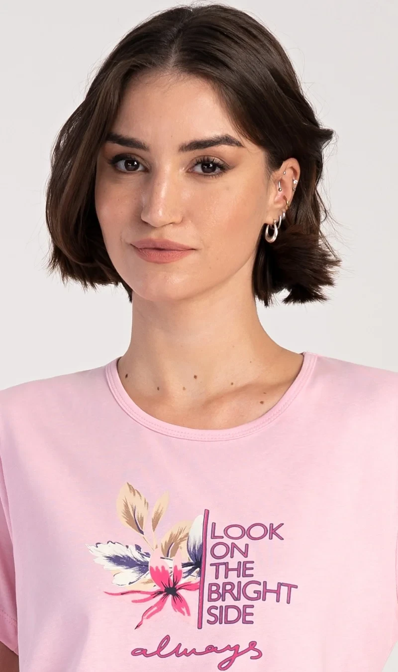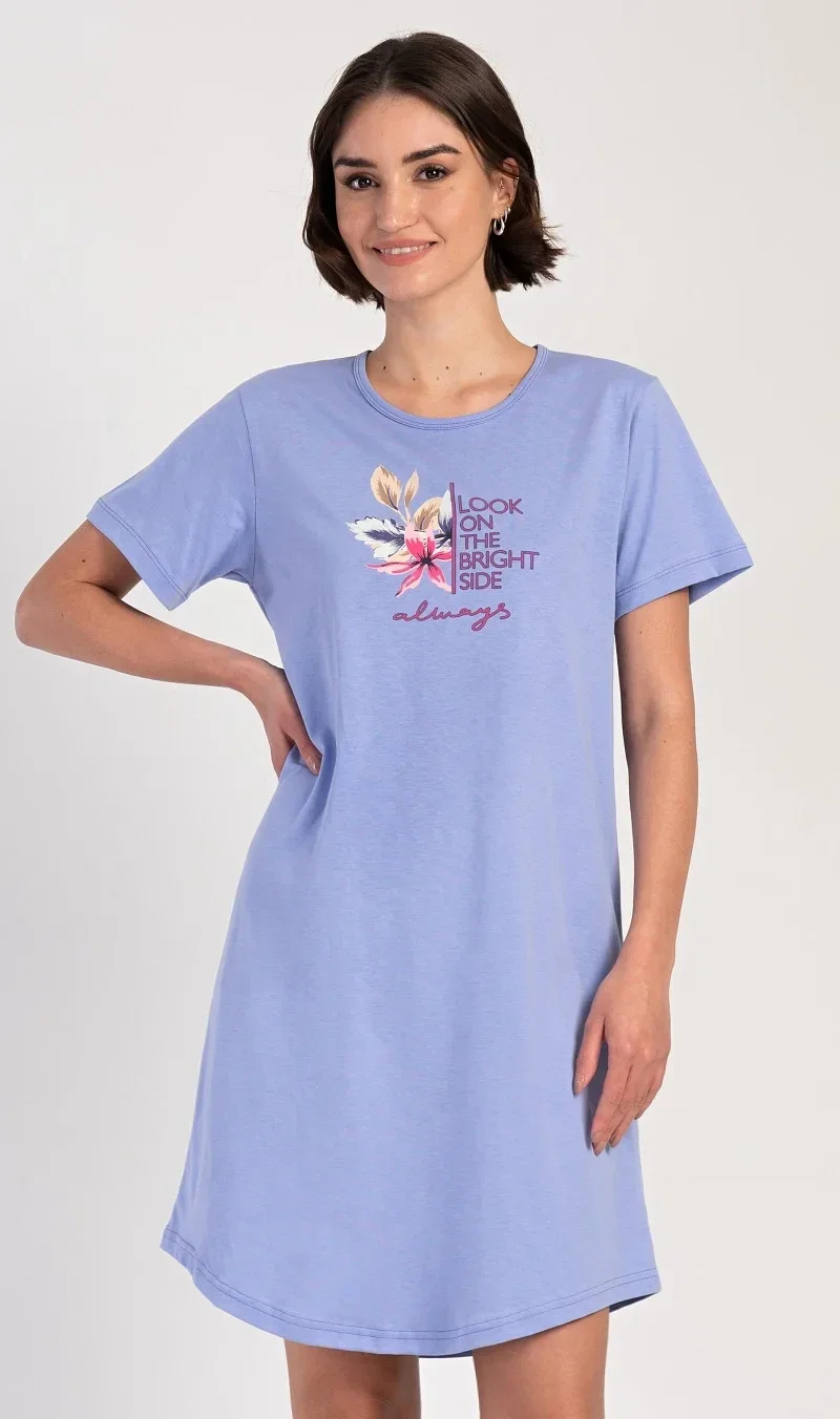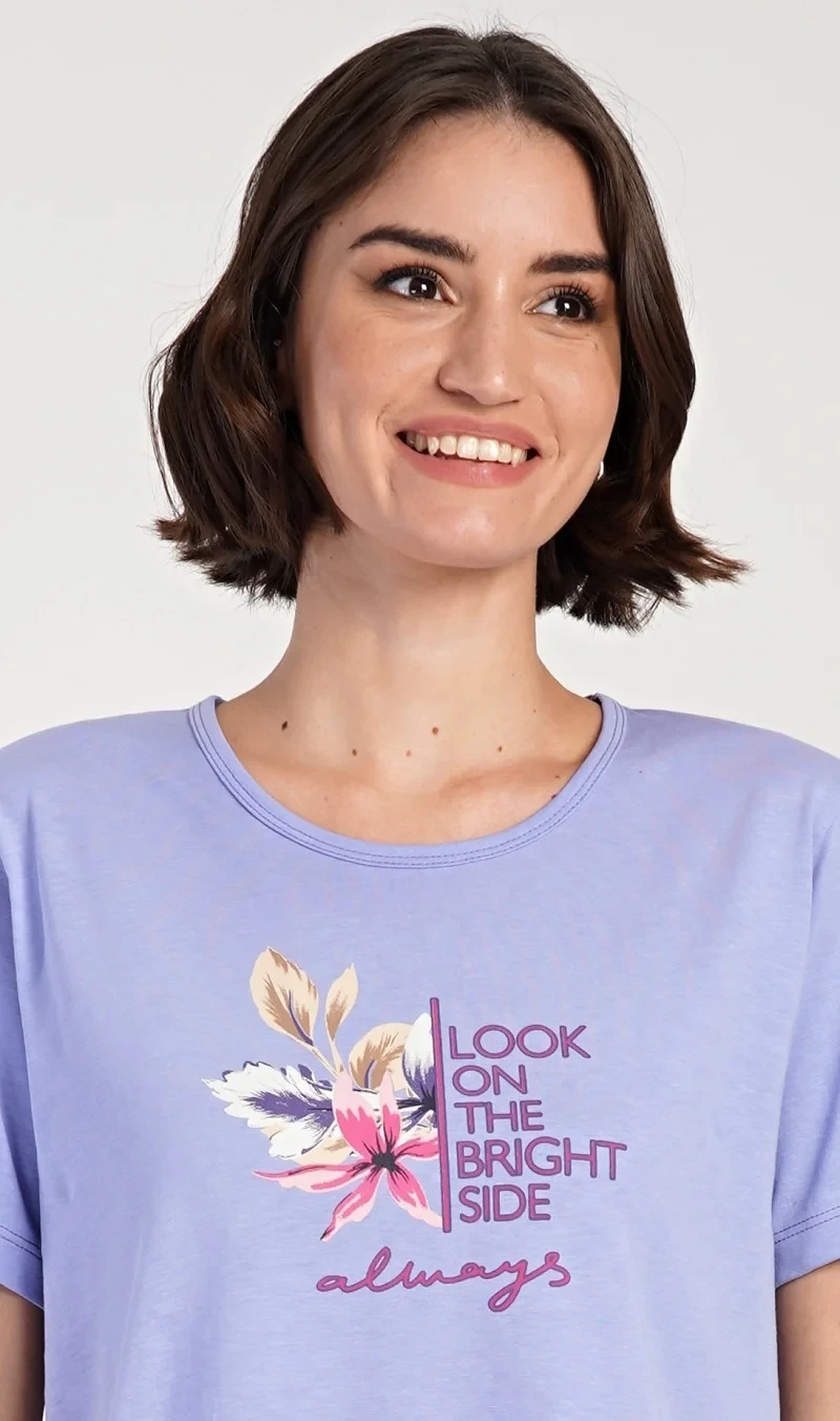 Dámská bavlněná noční košile s krátkým rukávem Elizabeth. Noční košile s kulatým výstřihem a příjemnou délkou nad kolena má na hrudi obrázek exotických květů a nápis 'Look on the bright side always'. Použitý materiál s obsahem bavlny 100% je příjemný a poddajný na dotek.