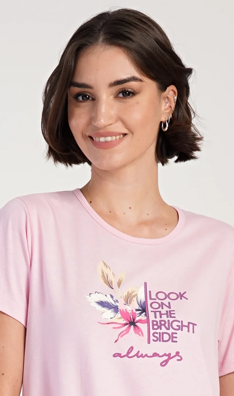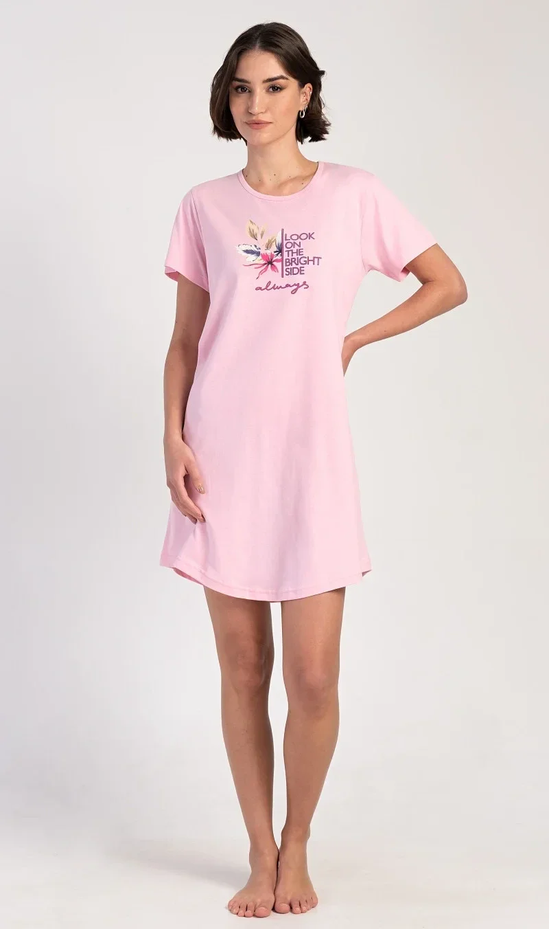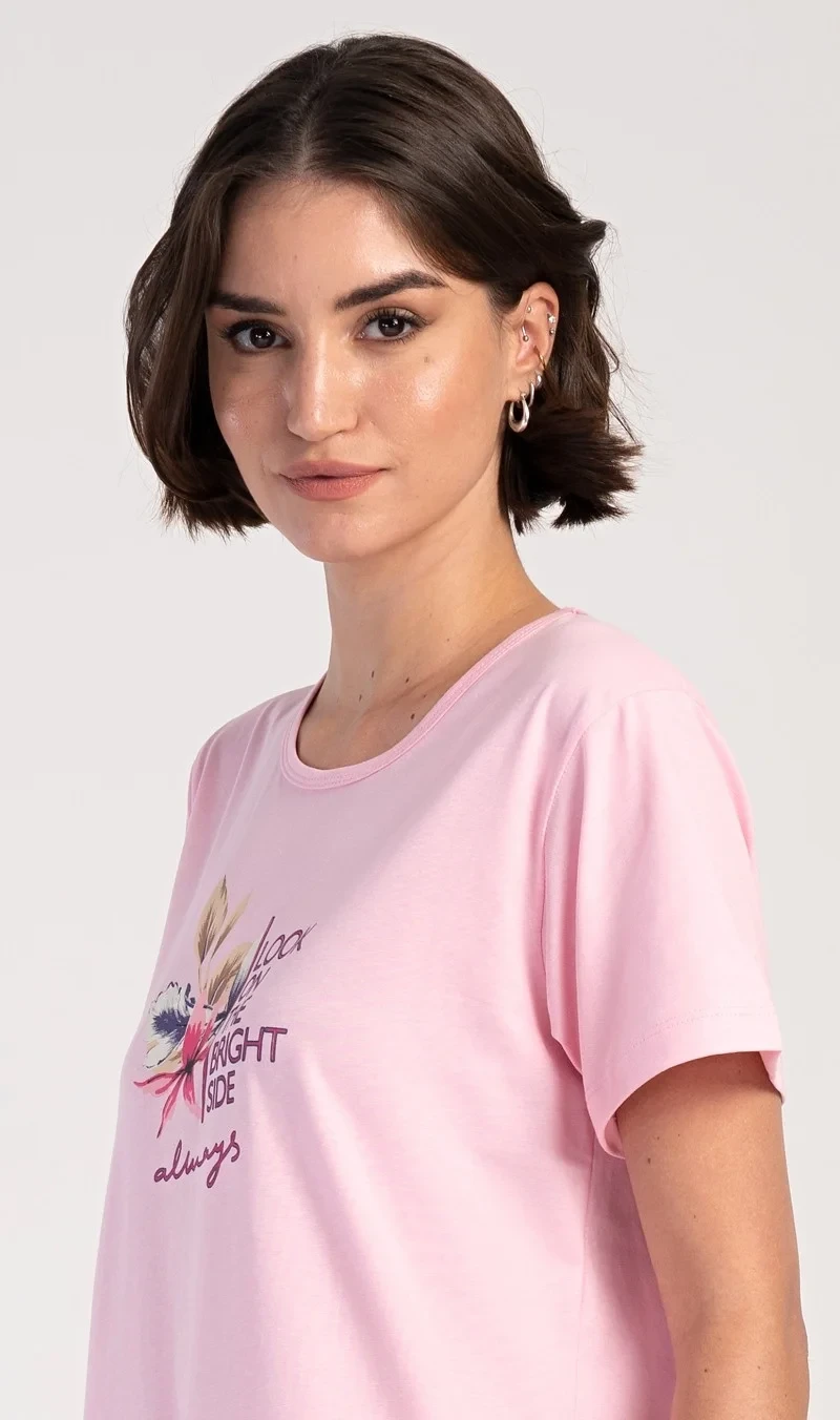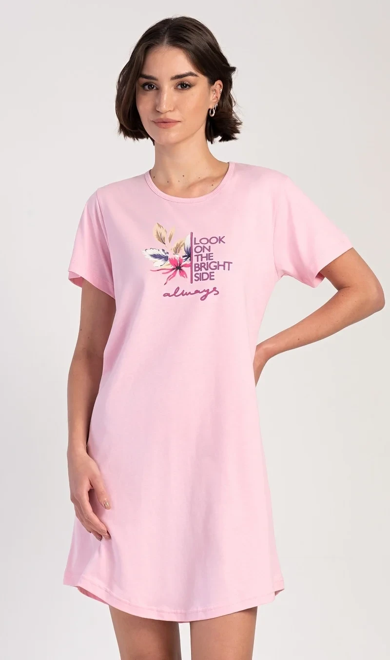 Dámská bavlněná noční košile s krátkým rukávem Elizabeth. Noční košile s kulatým výstřihem a příjemnou délkou nad kolena má na hrudi obrázek exotických květů a nápis 'Look on the bright side always'. Použitý materiál s obsahem bavlny 100% je příjemný a poddajný na dotek.