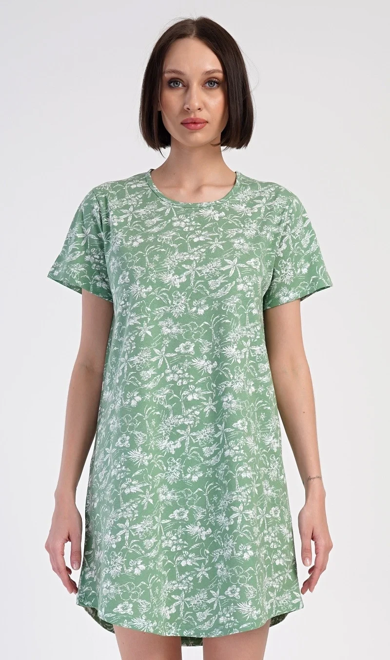 Dámská bavlněná noční košile s krátkým rukávem Hawaii. Dámská noční košile s kulatým výstřihem má příjemnou délkou nad kolena. Košilka s krátkým rukávem je potištěna palmami a exotickými květy v zeleno-bílé kombinaci. Použitý bavlněný materiál je příjemný a poddajný na dotek.