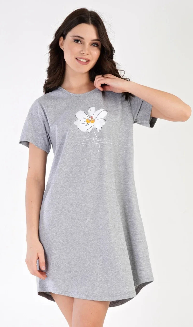 Dámská noční košile s krátkým rukávem Helena. Noční košile s kulatým výstřihem má na hrudi obrázek květu a drobný nápis. Použitý materiál s obsahem bavlny 70% je příjemný a poddajný na dotek.
