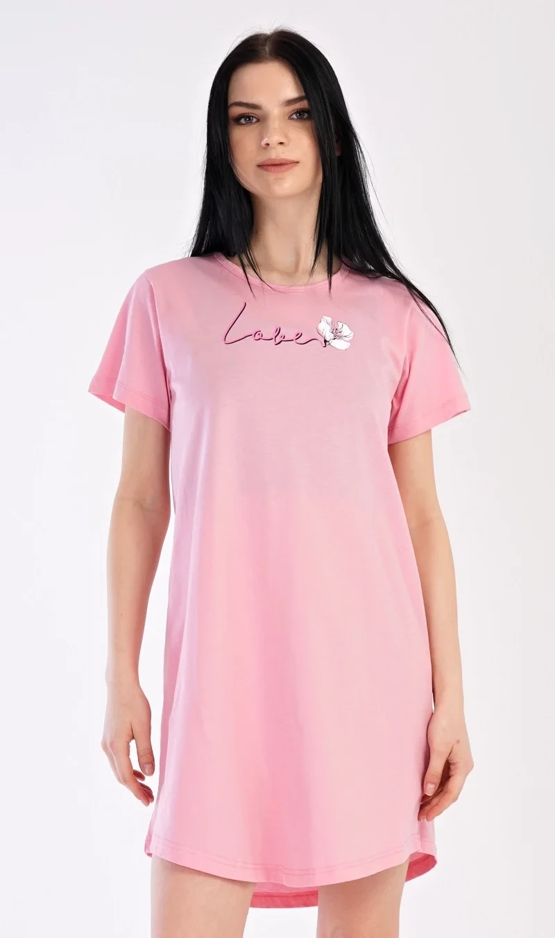 Dámská bavlněná noční košile s krátkým rukávem I love you. Noční košili s kulatým výstřihem zdobí obrázek květu a nápis LOVE, který zároveň tvoří stonek květu. Použitý bavlněný materiál je příjemný a poddajný na dotek.