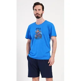 Pánské bavlněné šortkové pyžamo Motorkář. Pánské pyžamo se skládá z trička s krátkým rukávem a krátkých šortkových kalhot. Na jednobarevném tričku je obrázek medvěda na motorce a nápis 'Motorcycle'. Šortky mají praktické kapsy, v pase gumu a šňůrku na stáhnutí. Použitý materiál s podílem bavlny 100% je příjemný a poddaný na dotek. Pyžamo je vhodné i na denní nošení a oceníte ho obzvlášť v horkých letních dnech.