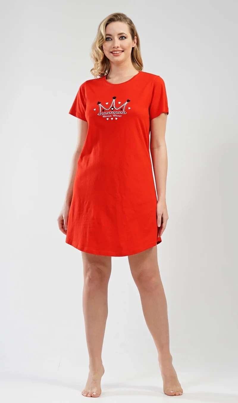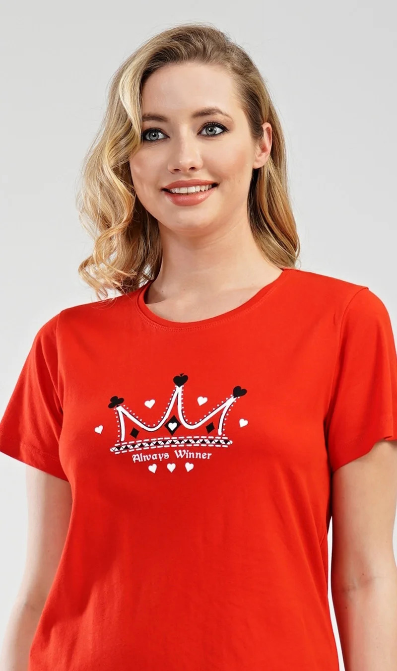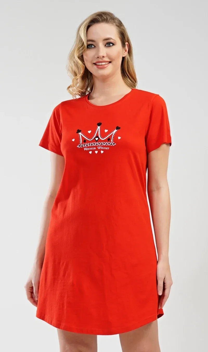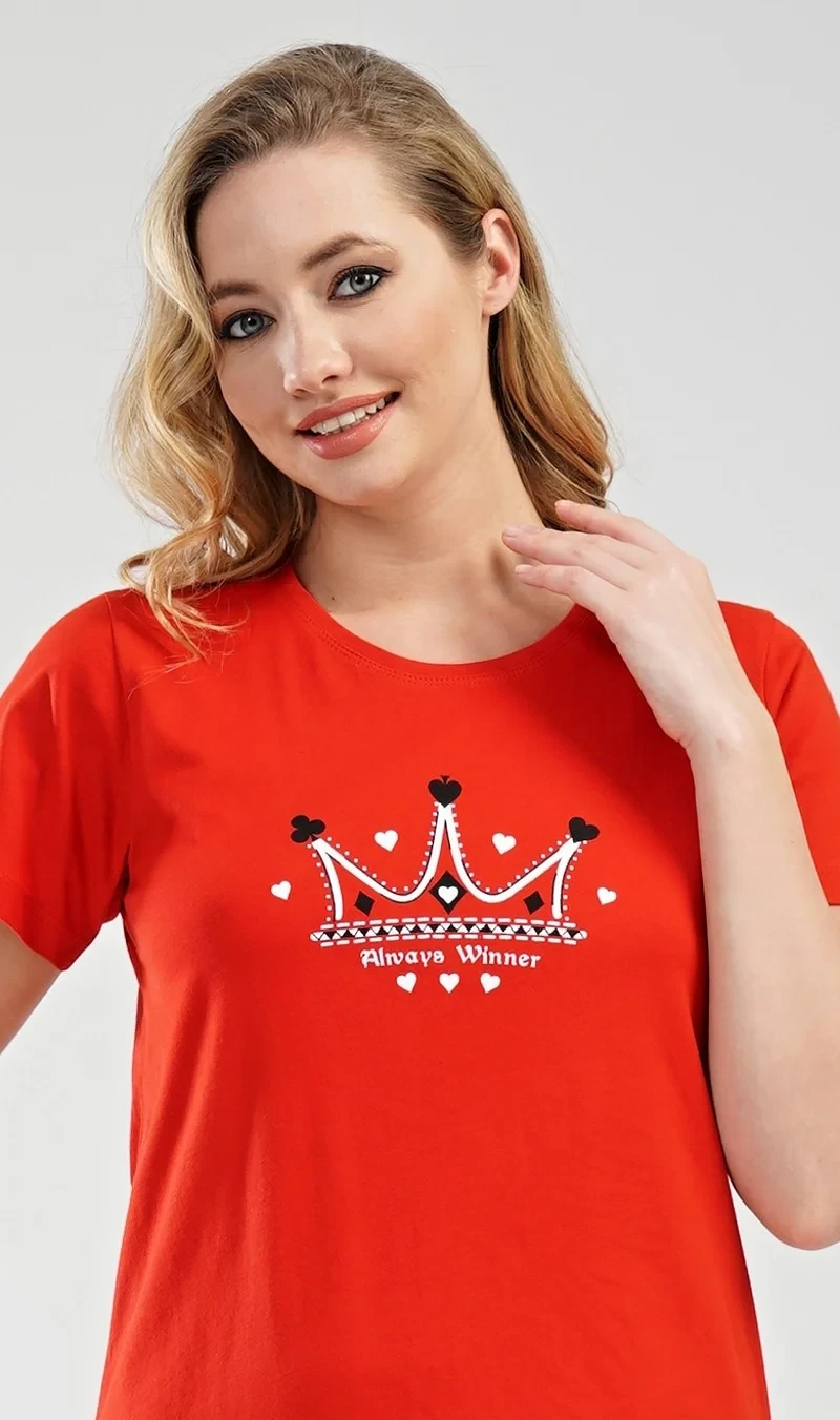 Dámská noční košile s krátkým rukávem Koruna. Dámská noční košile má na hrudi obrázek koruny doplněný karetními symboly s nápisem Always Winner. Použitý materiál je jemný a poddajný na dotek. Košile je vhodná na denní nošení.