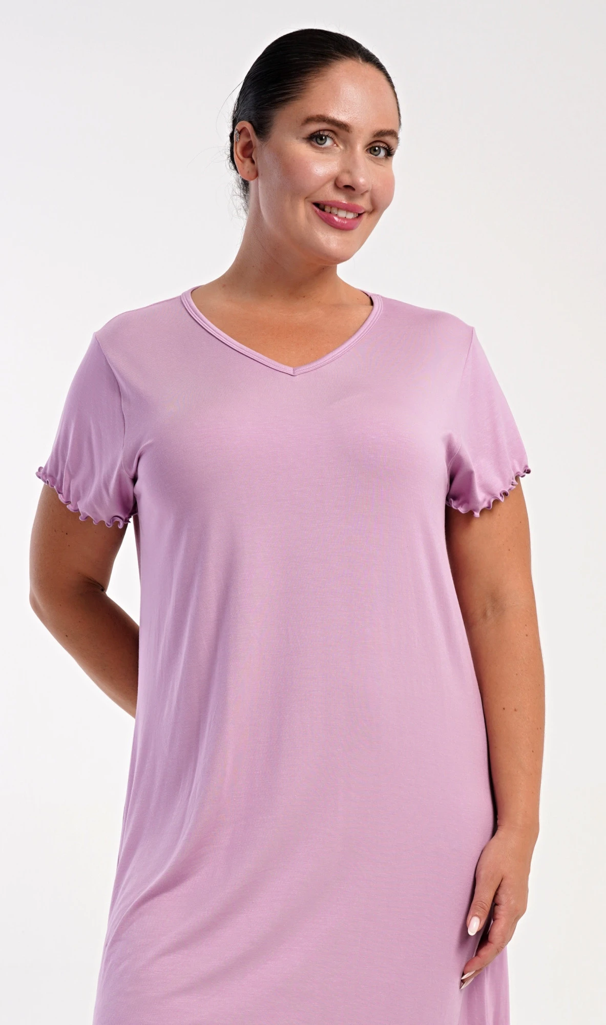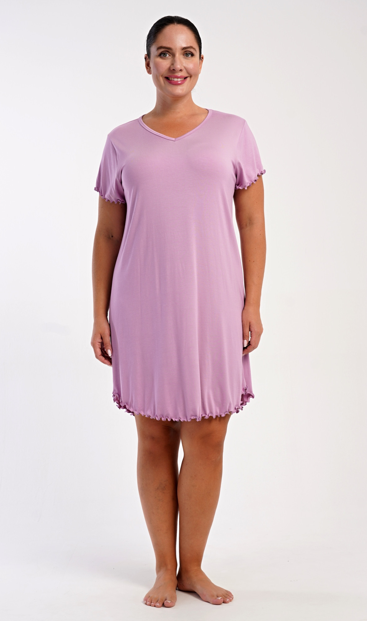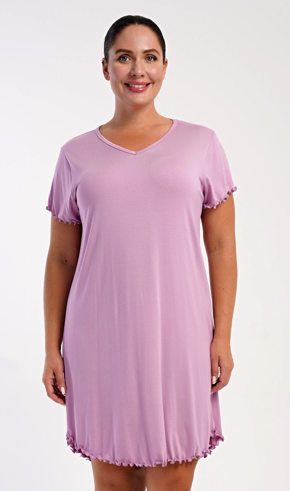 Dámská bavlněná noční košile s krátkým rukávem Liliana. Košile má příjemnou délkou nad kolena a výstřih do V, je ozdobena žlábkováním na rukávech a spodním lemu. Použitý materiál s podílem bavlny 95% je příjemný a poddajný na dotek.