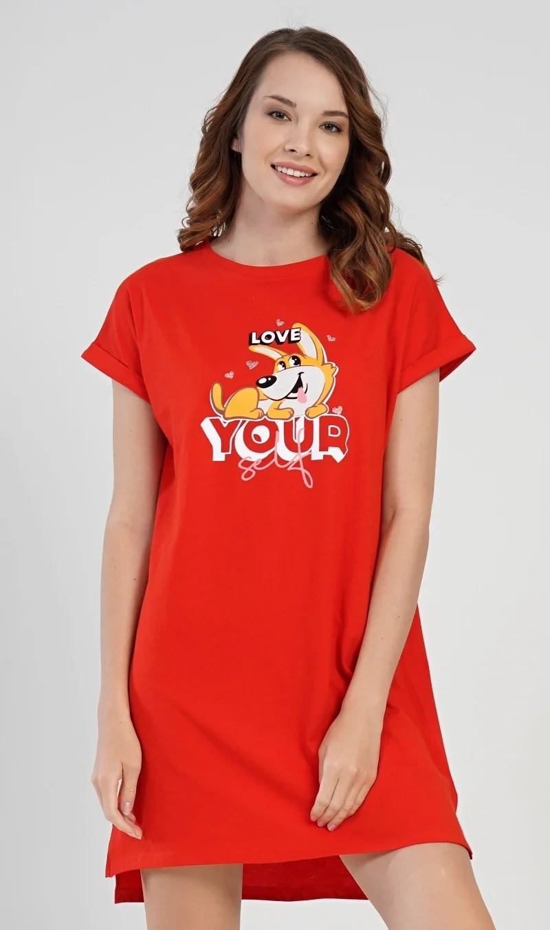 Dámská noční košile s krátkým rukávem Love your self. Dámská noční košilka s efektem ohrnutých rukávů má na hrudi obrázek roztomilého pejska obklopeného srdíčky, ležícího na nápisu Love your self. Použitý materiál je jemný a poddajný na dotek. Košile je vhodná na denní nošení.
